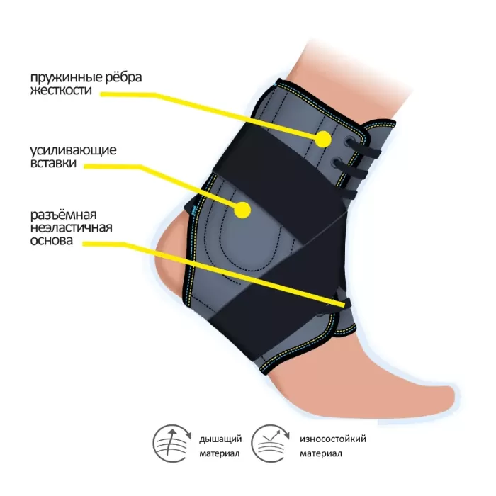 - надежная фиксация голеностопного сустава за счет съемных боковых пластиковых вставок и U- образных ребер жесткости. Они смоделированы по форме голеностопного сустава, что дает дополнительную жесткость конструкции, возможность регулировки степени фиксации. Неэластичный съемный ремень по типу «крестообразной повязки» помогает закрепить бандаж в нужном положении;