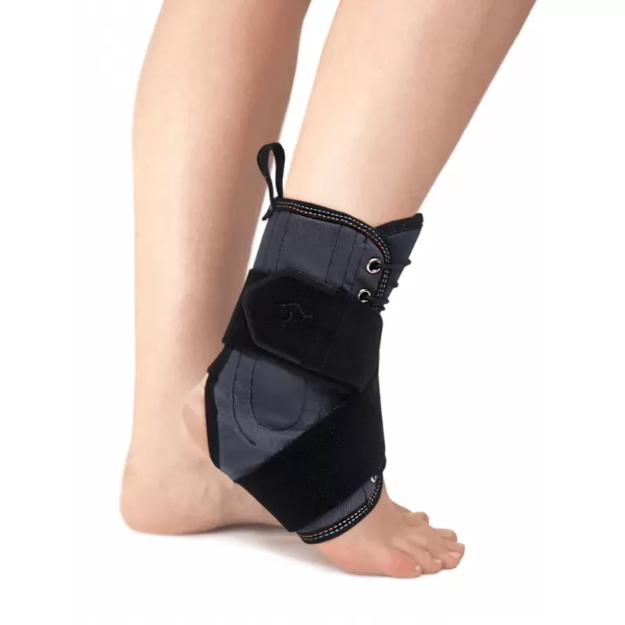 - Надежно удерживает голеностопный сустав при помощи шнуровки, ремня и специальных вставок.