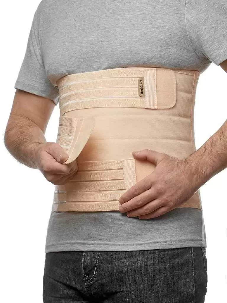 - Бандаж изготовлен из эластичных воздухо- и влагопроницаемых материалов, состоит из широкого пояса на застежке с двумя ребрами жесткости по бокам.