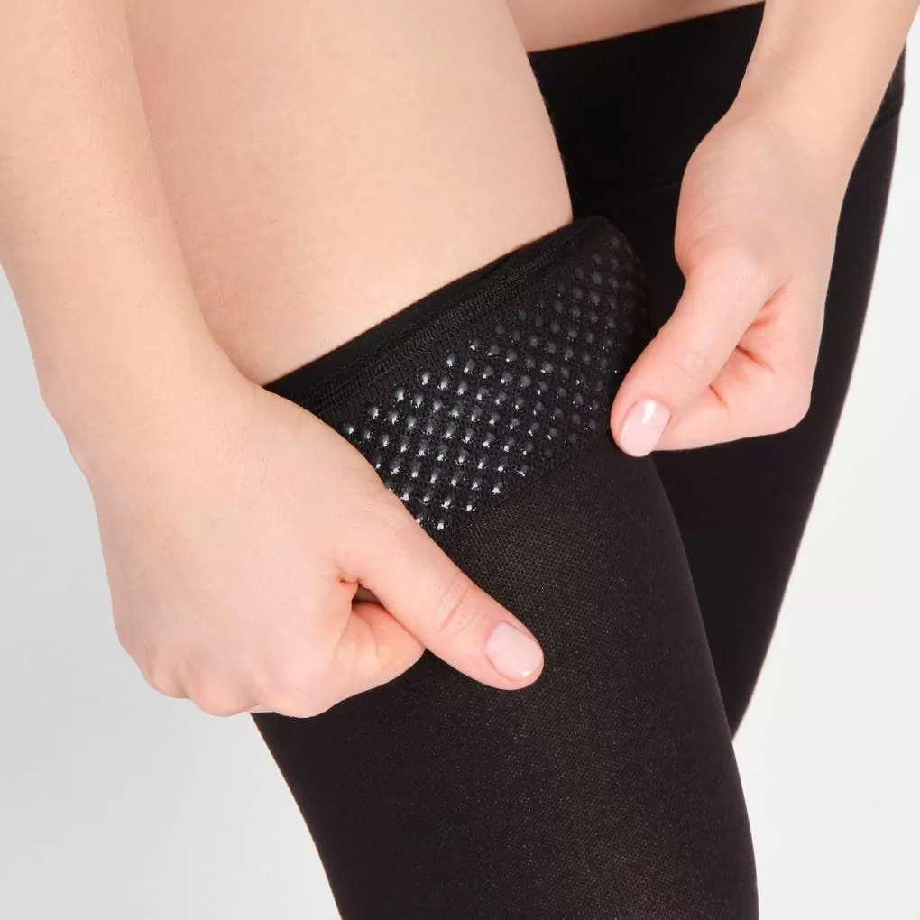 - для чулок с силиконовой лентой – не смазывать кремом или мазью ту часть ноги, куда приклеивается силиконовая лента;