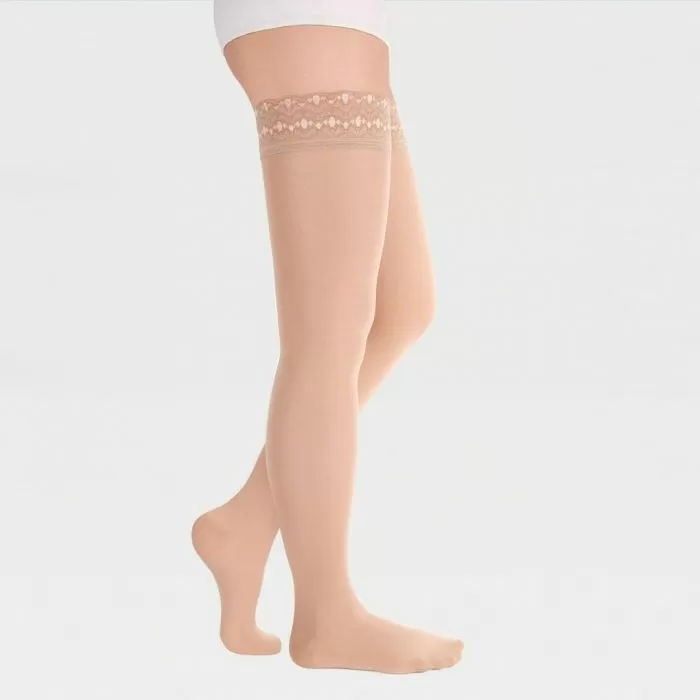- резинка на силиконовой основе, в том числе на широкое бедро, мягко фиксирует чулок , не нарушая кровотока