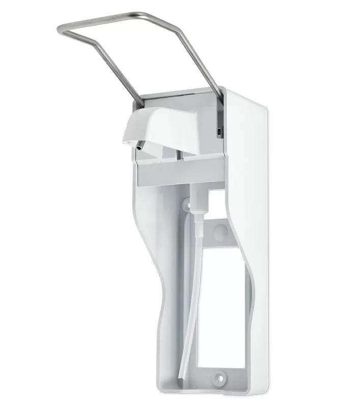 - Дозатор оснащен длинным рычагом для локтевого нажатия. Благодаря этому избегается контаминация рук. При необходимости дозатор можно легко снять и произвести очистку теплой водой. Насос из нержавеющей стали выставлен на оптимальное количество дозирования 1,5мл.