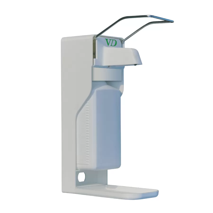 Устройство настенное с ручным локтевым приводом VD-20 для дозированной выдачи дезинфицирующих средств (в том числе кожных антисептиков), лекарственных антисептических средств, а также иных средств для обработки рук, предназначенное для подачи определенных (в соответствии с нормативными правовыми актами и инструктивно-методическими документами) порций, дезинфицирующих, антисептических, косметических и других средств в виде жидкостей, гелей, кремов и т.д. (различной степени вязкости), предназначенных для обработки кожных покровов, а так же перчаток надетых на руки, из полиэтиленовых бутылок.Устройство предназначено для применения в организациях здравоохранения, на предприятиях пищевой отрасли, общественного питания, торговли, на рынках, предприятиях бытового обслуживания, коммунальных объектах, в быту, в иных местах, организациях, учреждениях где нормативно-технической документацией предусмотрено проведение дезинфекции, антисептики и иных гигиенических мероприятий (в том числе мероприятий по уходу и защите кожных покровов).