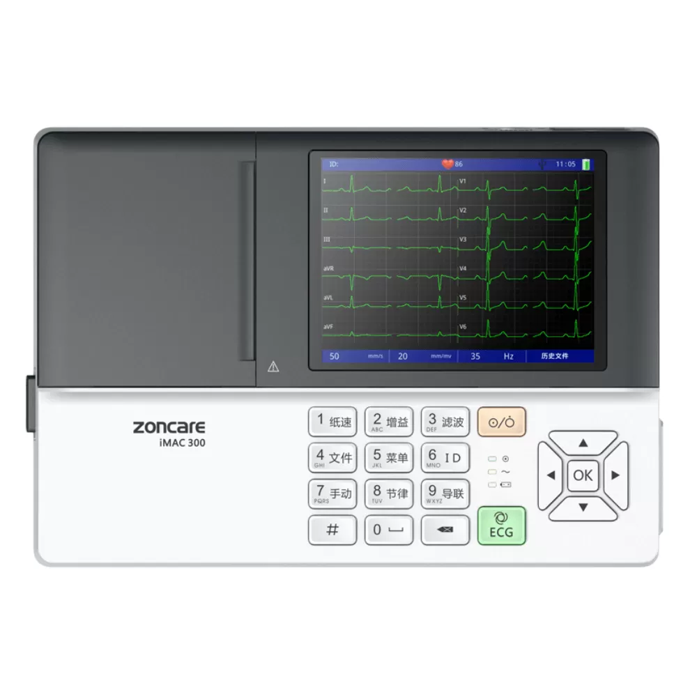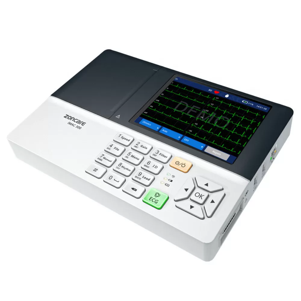 Модель имеет цветной дисплей 5,6 дюймов, память 1000 ЭКГ, встроенный аккумулятор, встроенный принтер, интерпретацию ЭКГ и небольшой вес