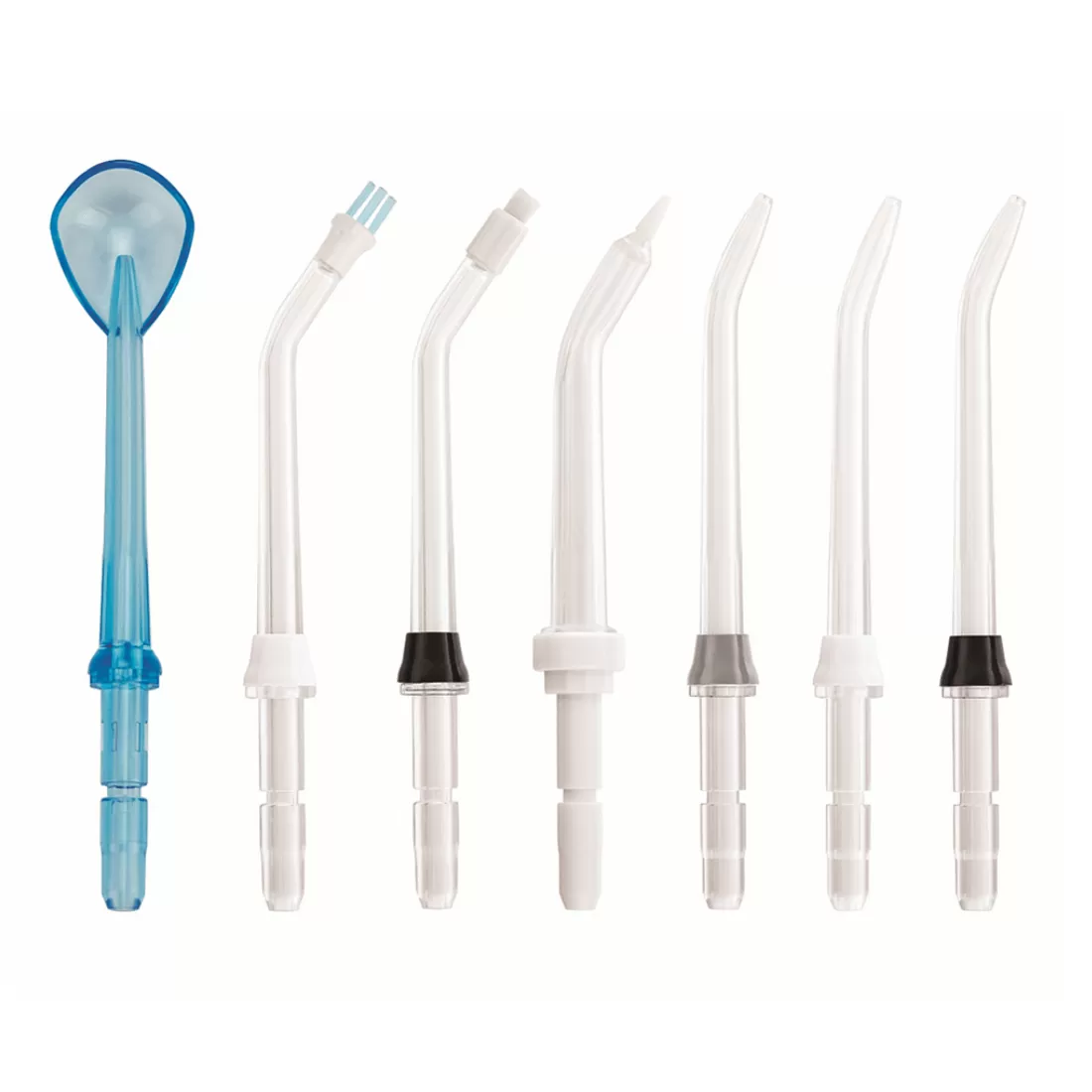 В комплект входят 7 функциональных насадок: 3 стандартные насадки, 1 ортодонтальная, 1 пародонтальная, 1 пучковая для очищения имплантов, мостов и коронок, 1 насадка для чистки языка. Функция вращения насадок на 360 градусов позволяет очищать даже труднодоступные участки полости рта.