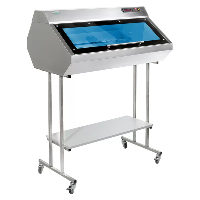 - металлического корпуса с прозрачной дверцей из поликарбоната полностью задерживающей УФ-излучение (корпус закреплен на тележке)
