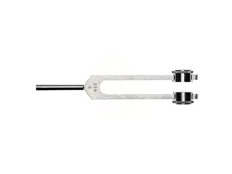 - Камертон оснащен дополнительными утолщениями на вилке — алюминиевыми гирьками, которые необходимы для диагностики проводимости черепных косточек и слухового аппарата