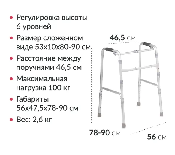 - Ходунки можно легко и быстро сложить, не используя для этого дополнительных приспособлений. Каркас выполнен из прочного и легкого металла, что увеличивает срок его эксплуатации и повышает надежность. Гарантийный срок – 1 год.