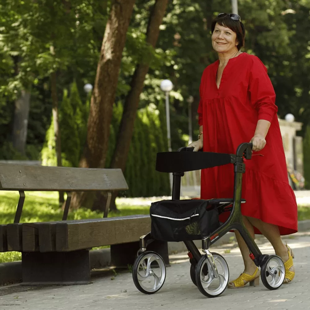 - Ходунки-роллаторы оснащены мягким сиденьем и мягким упором для спины