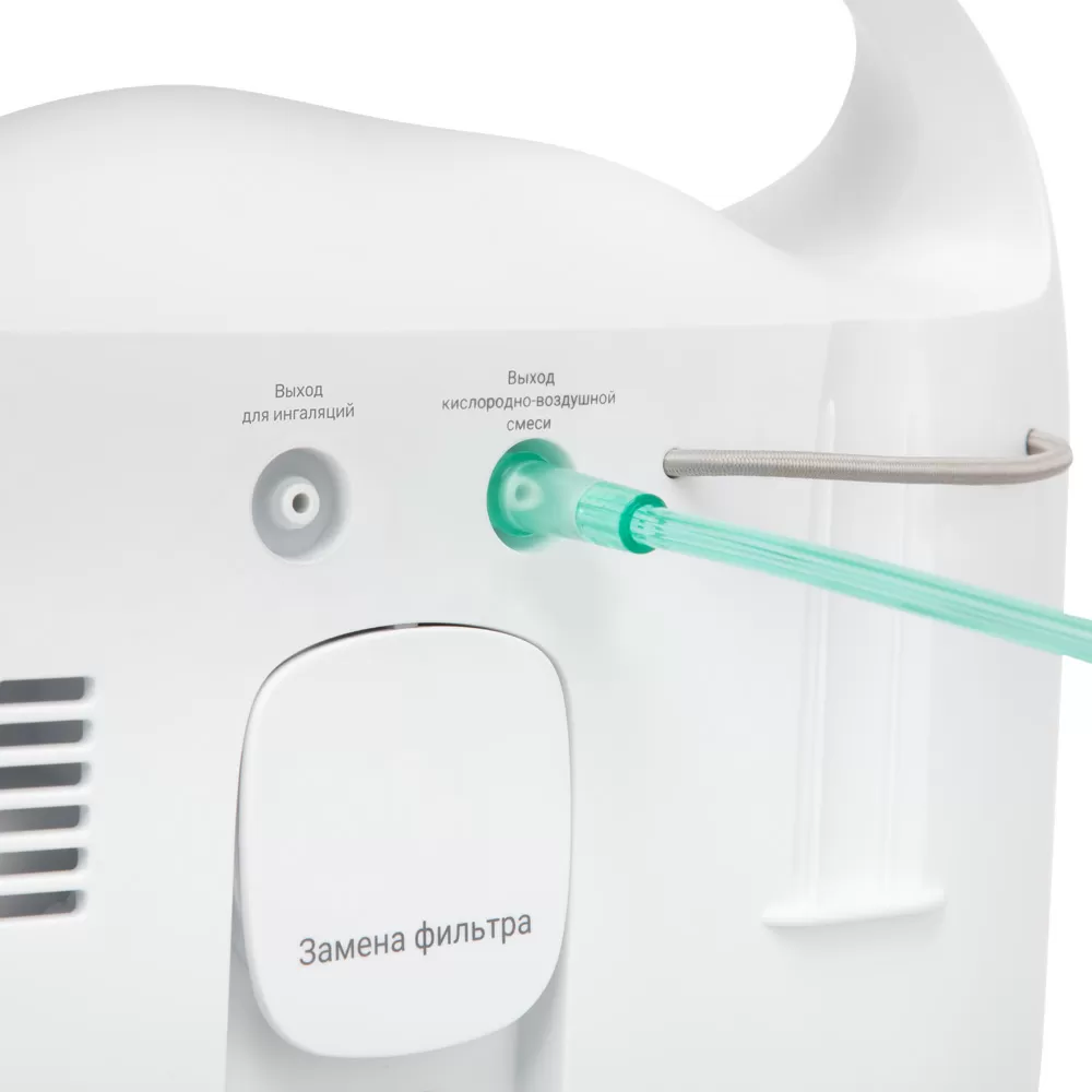 - Выход для ингаляций. На панели прибора расположен отдельный выход для проведения ингаляций, позволяющий использовать концентратор кислорода в качестве небулайзера при лечении респираторных заболеваний. Набор для ингаляций, состоящий из соединительного воздушного шланга, распылителя и мундштука, входит в комплект.