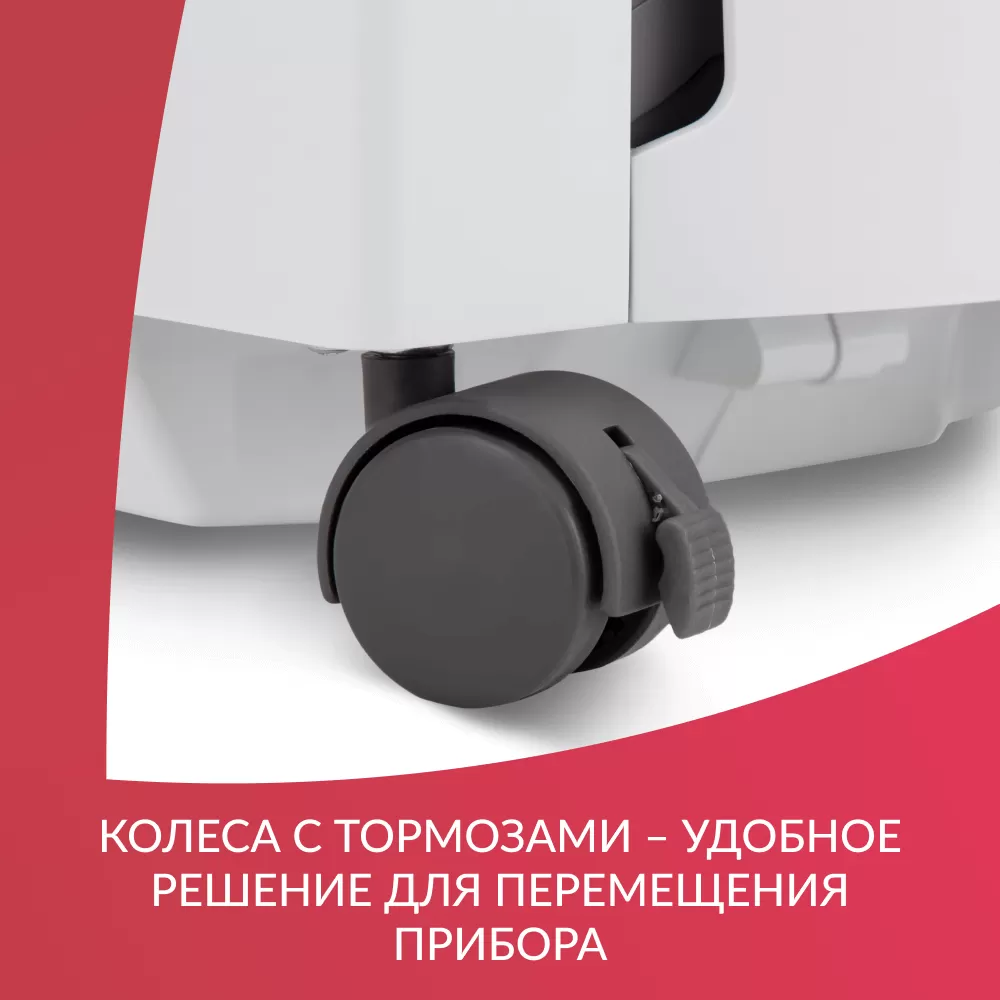 - Продуманная конструкция. Корпус изготовлен из ударопрочного пластика и оснащён боковыми ручками и манёвренными колёсами с фиксаторами. В корпусе предусмотрена ниша с дверцей, в которой расположен съёмный увлажнитель, повышающий влажность воздушно-кислородной смеси до номинального значения перед подачей пациенту. Дверца ниши и ёмкость увлажнителя изготовлены из прозрачного пластика для контроля уровня воды.