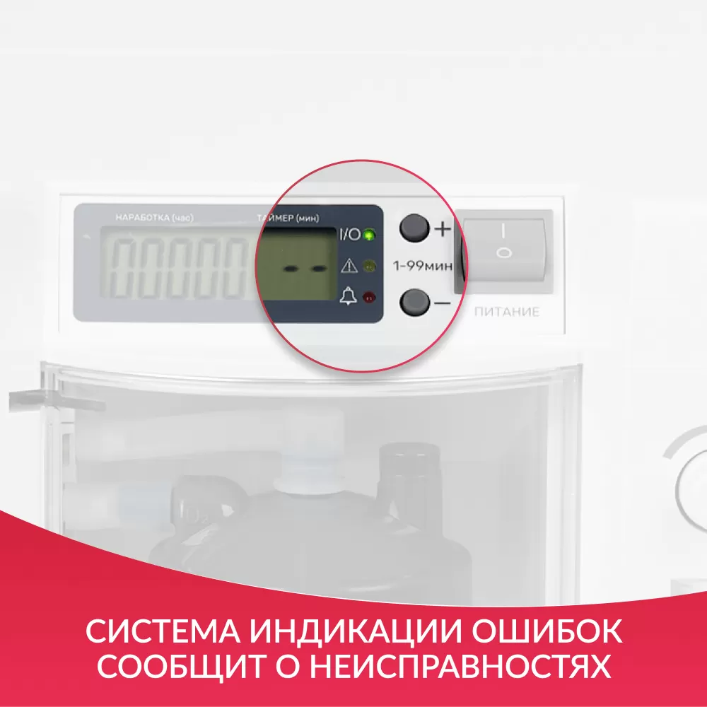 Индикаторы тревоги, встроенный таймер работы, плавная регулировка скорости потока; выход для ингаляций  |