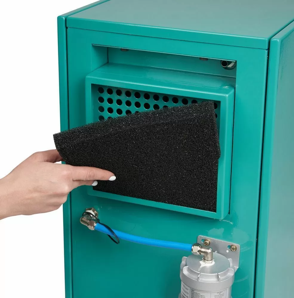- Оборудование имеет два уровня фильтрации воздушного потока - фильтры грубой и тонкой очистки. Фильтр грубой чистки легко и удобно чистить, он находится в кожухе на задней стенке корпуса. Фильтр тонкой очистки также легко заменить, откры боковую панель за левой дверцей аппарата.
