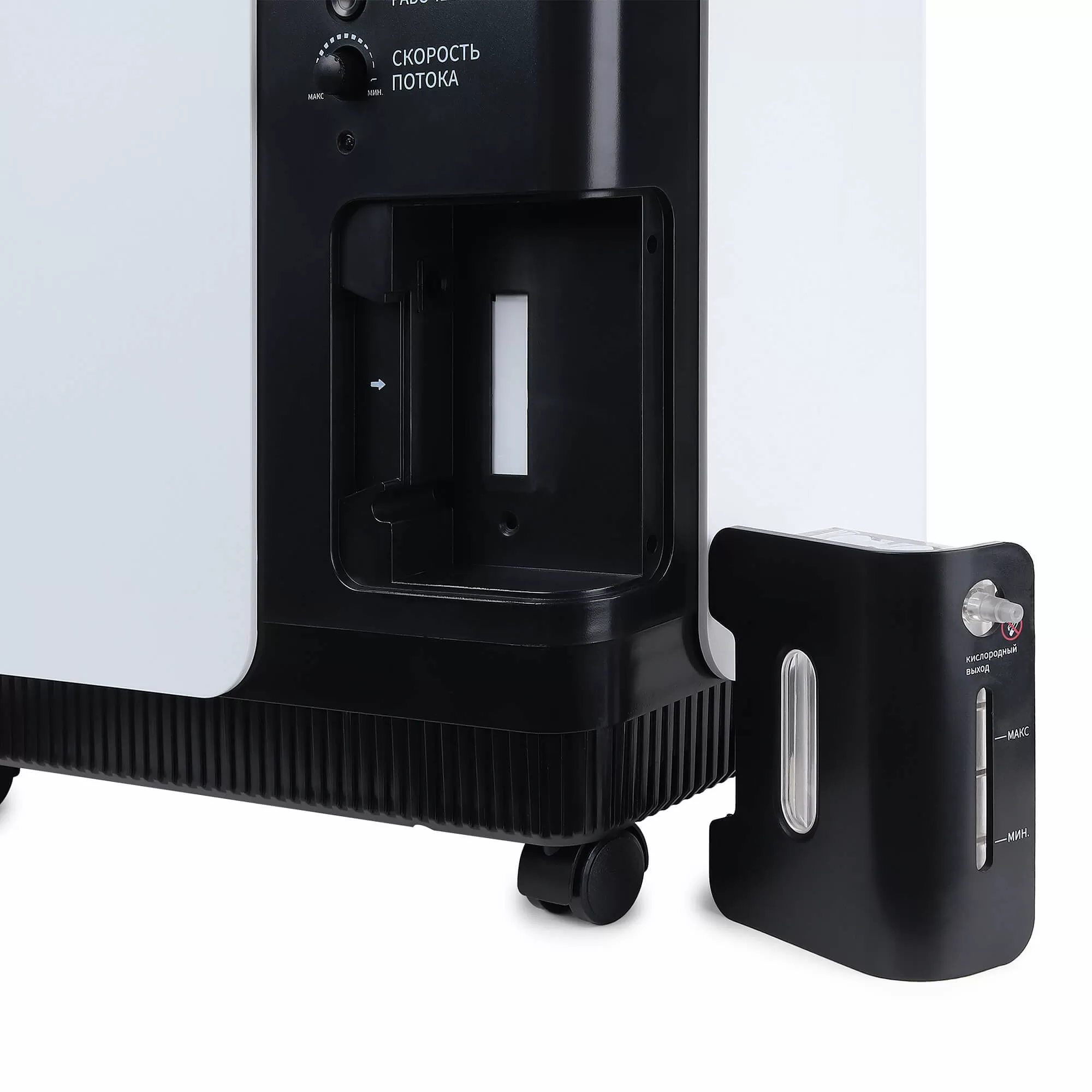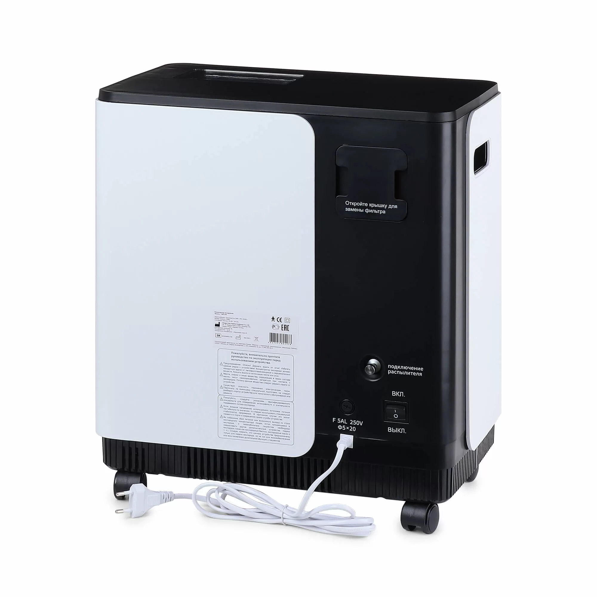 - Специальные углубления в боковых стенках корпуса для переноски и 4 колеса делают концентратор невероятно мобильным и простым в транспортировке.