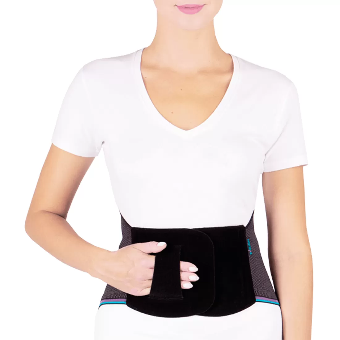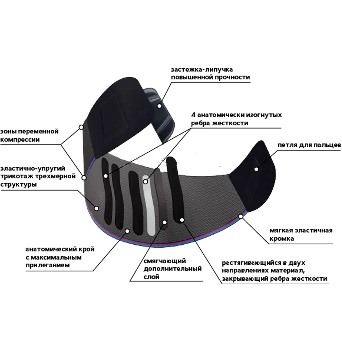 - анатомический крой и зоны переменной компрессии обеспечивают плотное облегание пояснично-крестцового отдела позвоночника, правильно распределяя давление, без пережатия сосудов