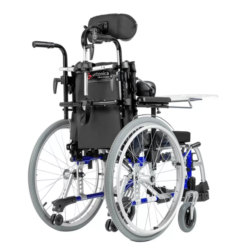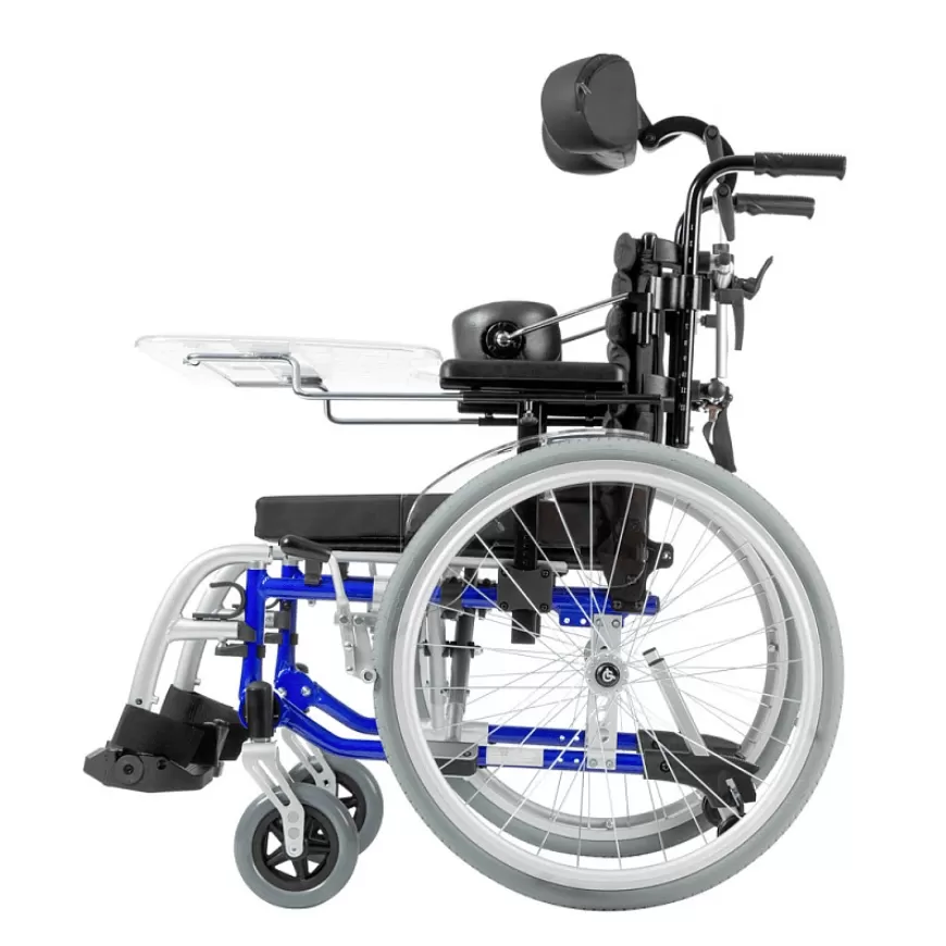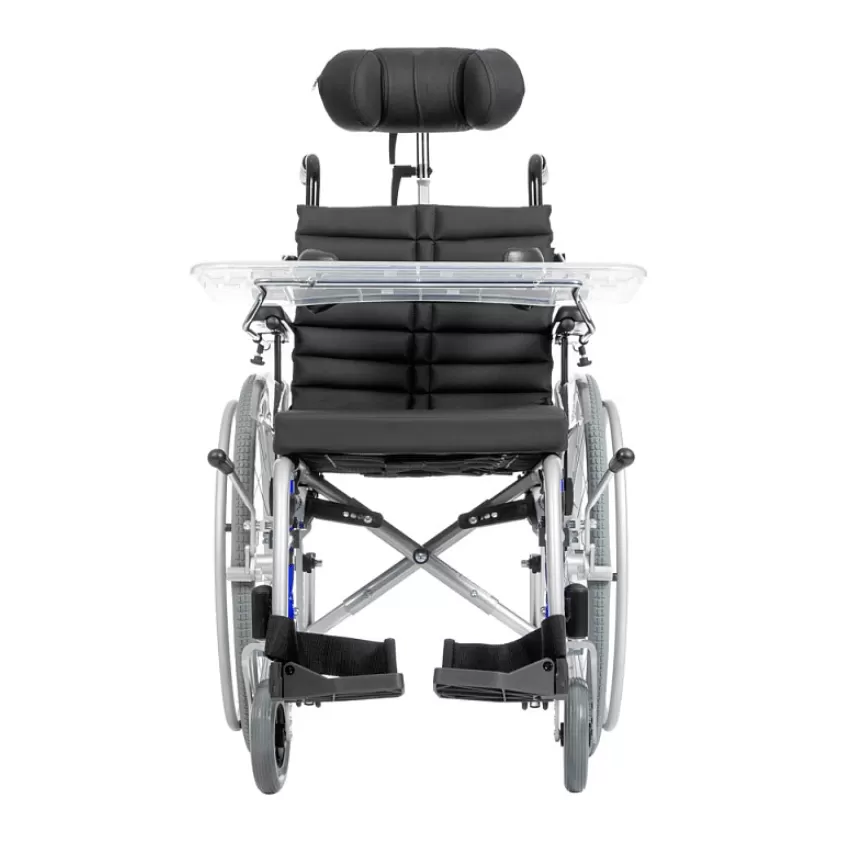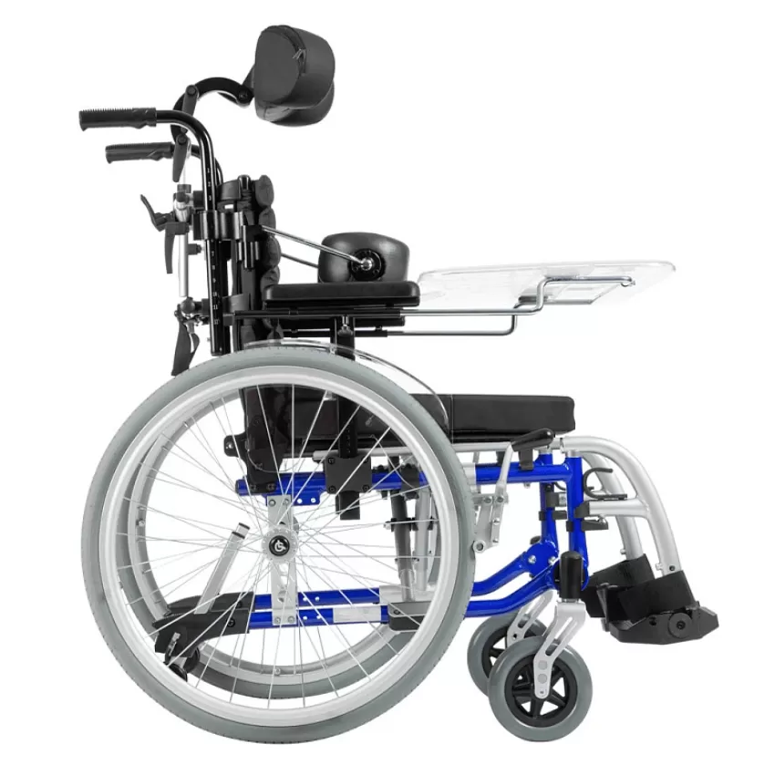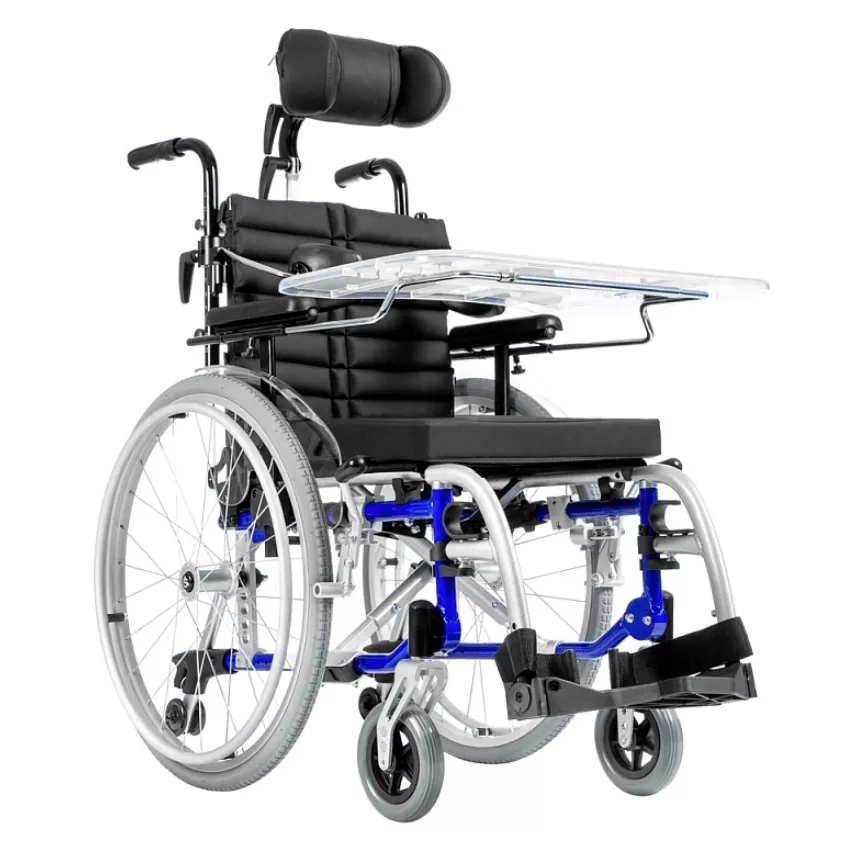 Подголовник и боковые поддержки коляски регулируются по вертикали, горизонтали, углу наклона и обхвату головы, обеспечивая надежную фиксацию и поддержку. Это помогает предотвратить деформации грудной клетки и позвоночника, а также улучшает постуральный баланс. Съемный столик служит дополнительной опорой для верхней части тела, что особенно полезно во время приема пищи.