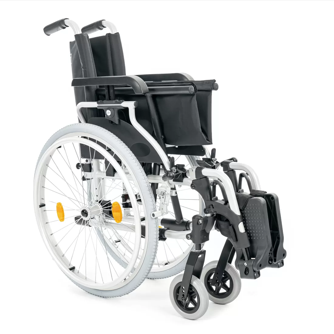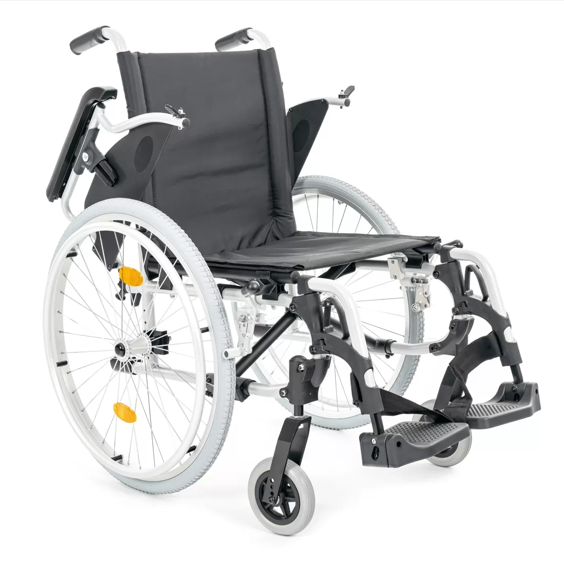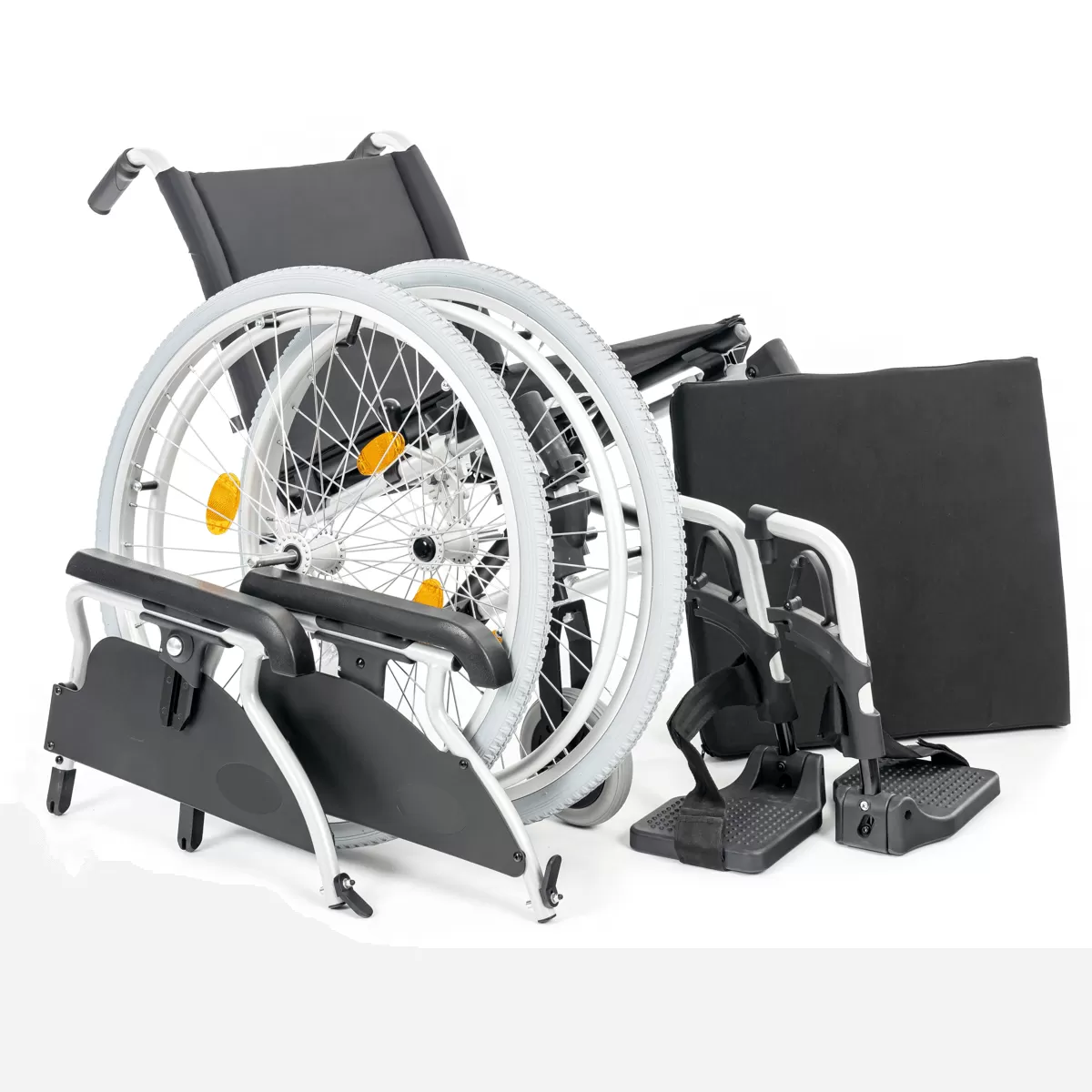 - Алюминиевая рама складывающаяся "сторона к стороне" посредством складного х-образного механизма, обладает минимальным для повседневного кресла-коляски весом