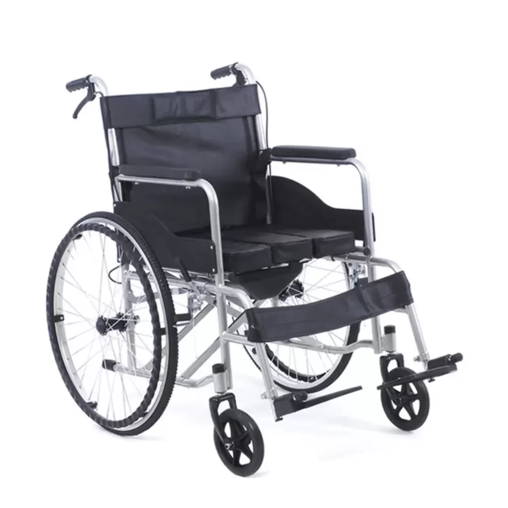 Домашняя кресло-коляска с пневматическими приводными колёсами диаметром 61 см, тормозами для помощника, расположенными на задних рукоятках и туалетным устройством, обеспечивающим полную автономность больного при совершении деликатных процедур.