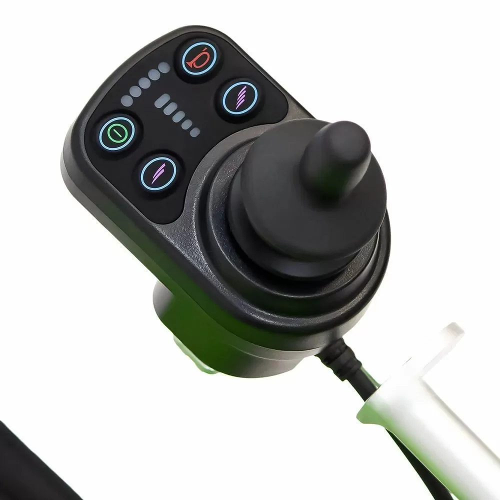Контроллер находится рядом с подлокотниками, и его можно установить, при необходимости, с любой удобной для пользователя стороны. На нем размещены джойстик для управления коляской, кнопка звукового сигнала, кнопка включения/выключения, а также кнопки регулировки скорости.Проходимость и ходовые качества