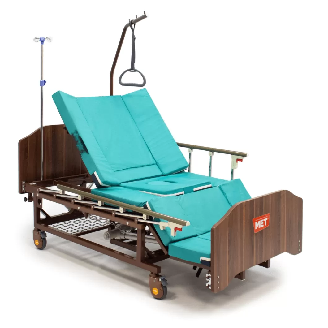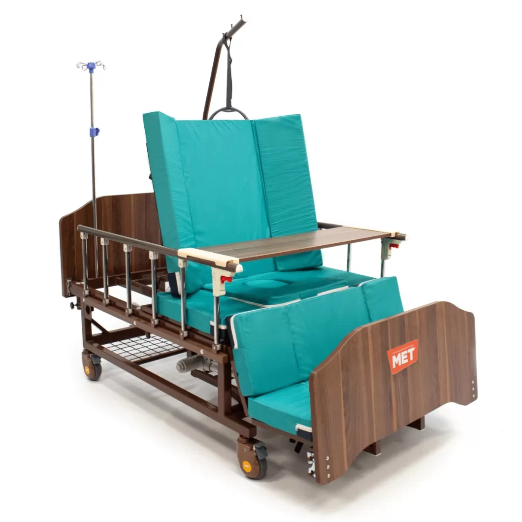 Медицинская кровать с механизмом переворачивания, снабжённым таймером и позволяющим ночную смену положения больного без контроля ухаживающего лица, полноценным положением кардио-кресло, опускающим все ножные сегменты к полу и электроприводным санитарным оснащением, которое при определённой сохранности моторных функций пациента обеспечит ему максимальную автономность. без, в любом случае, действующей на нервы помощи ухаживающих лиц.Увеличенная ширина ложа 1000 мм