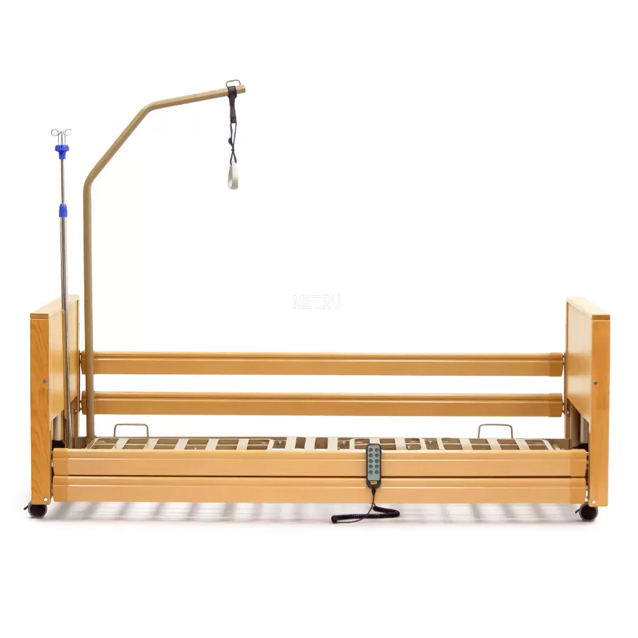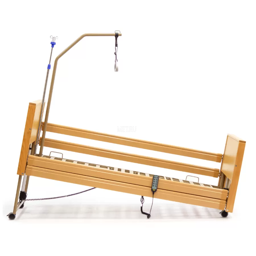 По периметру кровати предусмотрены четыре специальных отверстия для крепления инфузионной стойки и других аксессуаров. В комплектацию входит инфузионная стойка, а также штанга для подтягивания пациента, оснащенная регулируемой по высоте рукояткой.