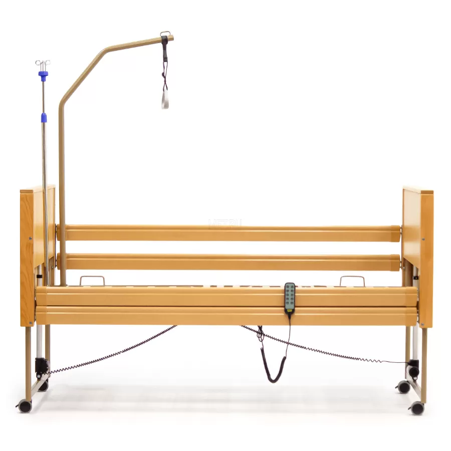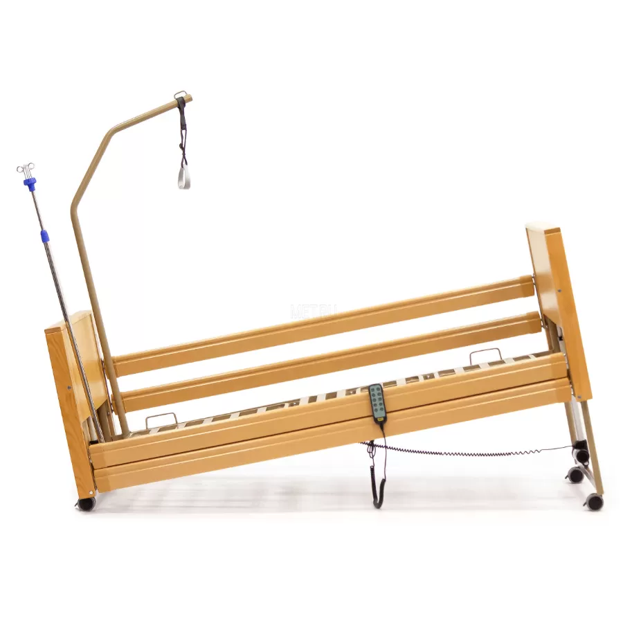 - Кровать оснащена функцией регулировки положения изголовья, ножной и бедренной секций, которая осуществляется с помощью проводного пульта управления. Механизм «растомат» отвечает за настройку ножной секции. Высота ложа также может быть изменена в зависимости от потребностей. Боковые ограждения легко опускаются, что обеспечивает удобный и быстрый доступ к пациенту.