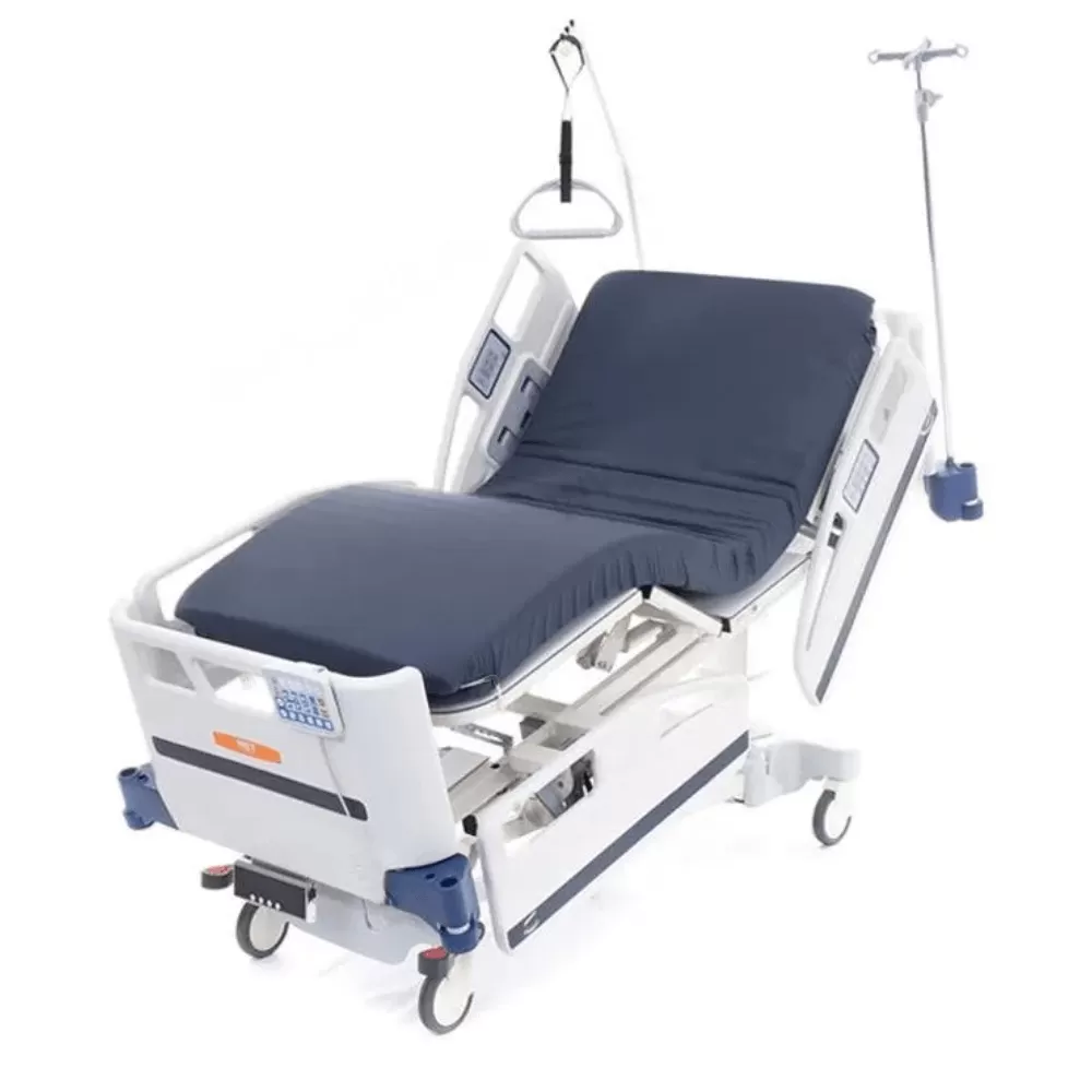 Функциональная кровать для палат интенсивной терапии и отделений реанимации, поставляемая в максимальной комплектации и оснащённая всем необходимым функционалом для достижения необходимых медицинских положений и положений для комфортного бодрствования.