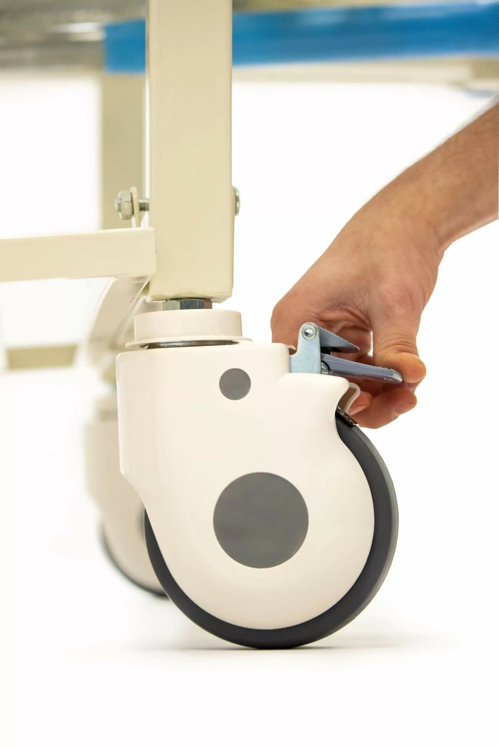 Колеса с широкими противопылевыми колпаками также оснащены индивидуальными тормозами-фиксаторами.