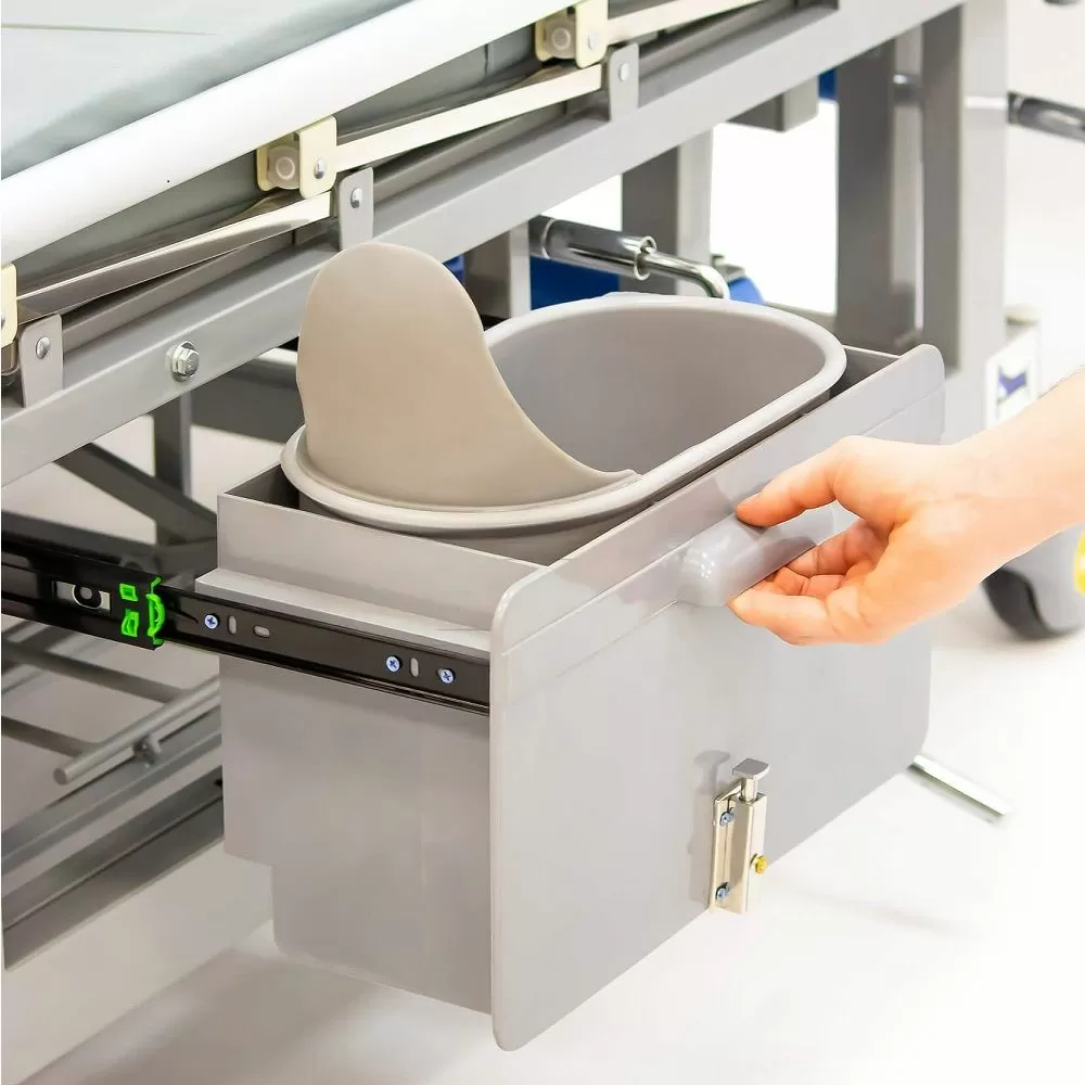 - Увеличенное туалетное устройство. В центральной части кровати расположен мягкий сегмент матраса, который отодвигается, открывая доступ к увеличенному санитарному устройству. По периметру санитарного проема предусмотрен специальный защитный бортик, предотвращающий расплескивание жидкости и обеспечивающий гигиеничность процедуры.