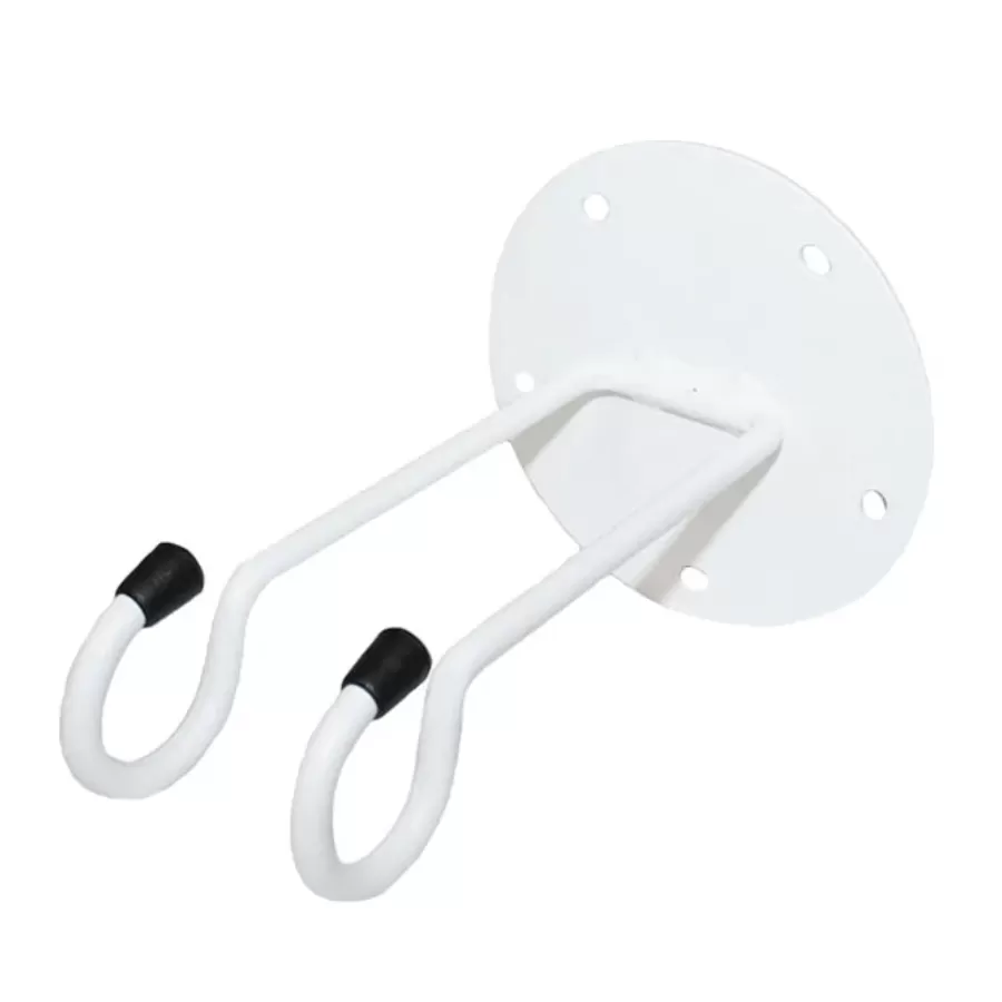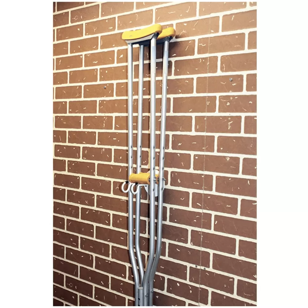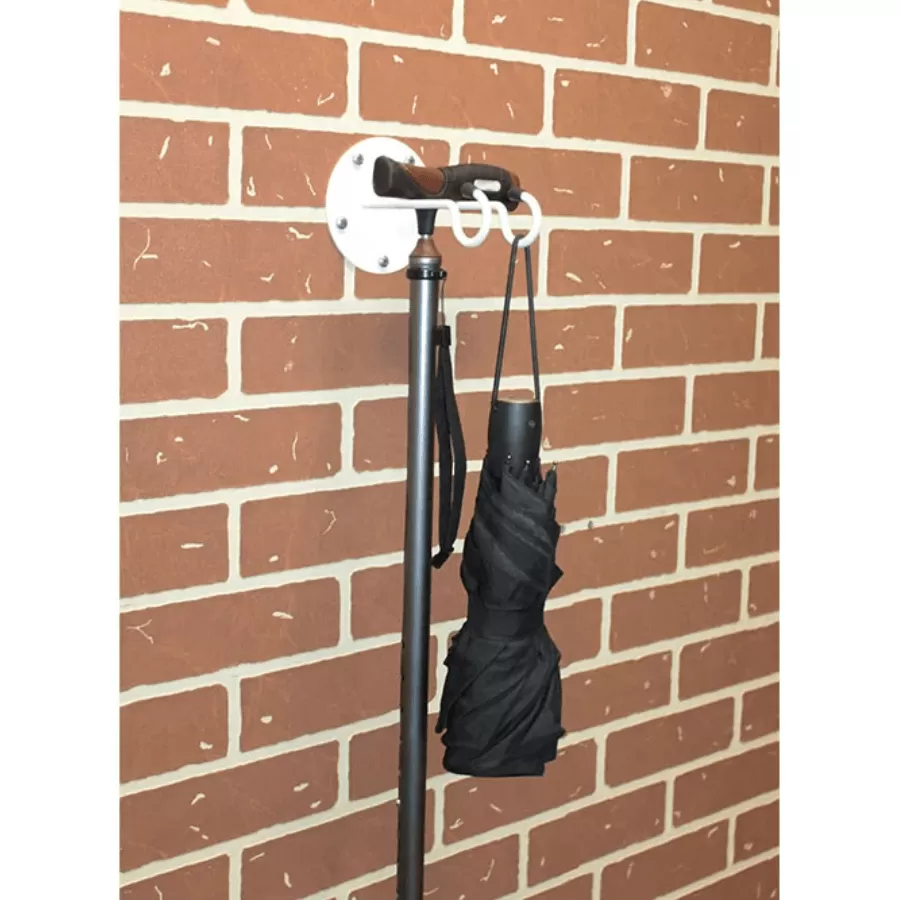 Крючок для трости и костылей Lucky Guy цвет белый муар, 1 шт 670 01 Т4-01 Б - универсальное решение для хранения трости, пары костылей дома, в офисе, медицинских заведениях. Отличная эргономика и функциональность. В монтажном основании d=104 мм пять отверстий d=5,6x7,6 для крепления к стене. Толщина основания 2 мм.Внутреннее расстояние между проволочными направляющими 38 мм. Вынос вперед для костылей и тростей 100 мм. Круглое окончание d=45 мм. Диаметр проволоки d=6 мм. На концы которой надеты декоративные пластиковые заглушки типа «капли дождя», черного цвета.