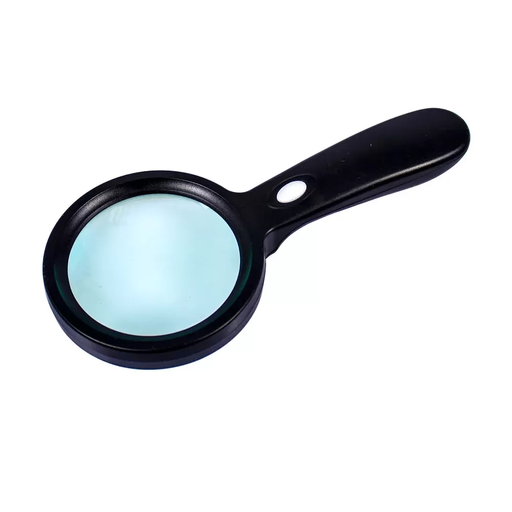 Лупа ручная круглая 10-кратная, диаметр 90 мм, со светодиодной подсветкой – 12 ярких светодиодов, расположенных возле линзы, при необходимости освещают объекты или читаемый текст.