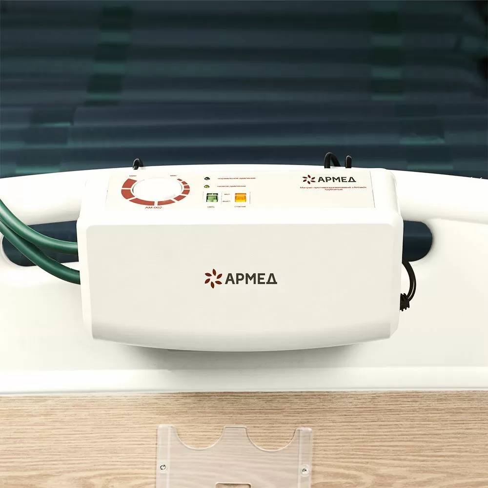 - Компактный и тихий компрессор распределяет воздух по секциям в заданном режиме. Прочно крепится на ограждении кровати с помощью крючков.