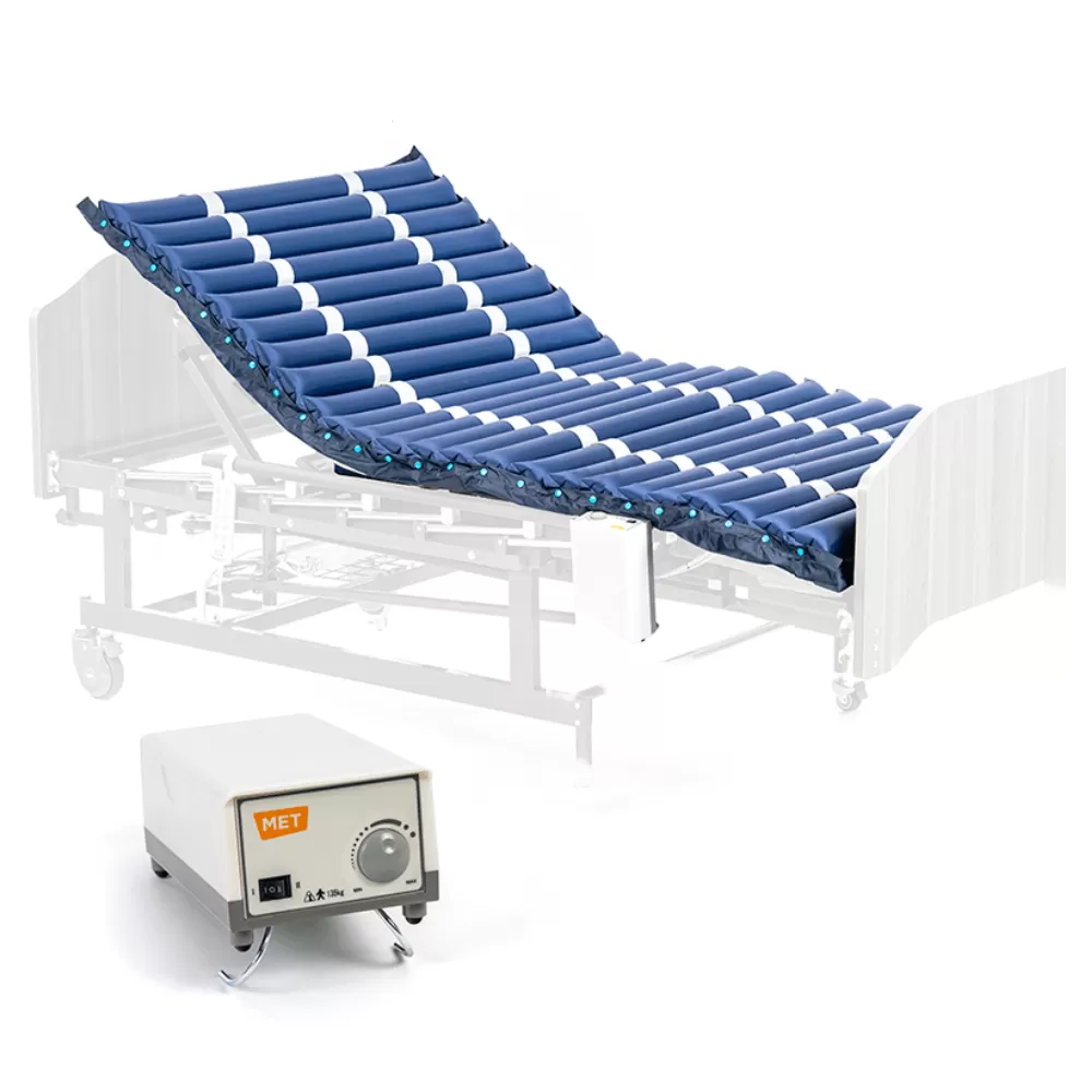 Малогабаритный электрокомпрессор размещается на полу или на боковой панели кровати. Регулировка задаваемого давления осуществляется в зависимости от массы пациента. Противопролежневый матрас обладает эффектом непрерывного массажа, предотвращает застои и не дает развиваться некрозу мягких тканей лежачего пациента.