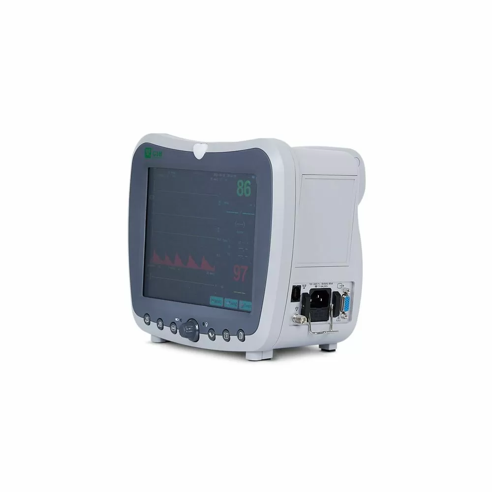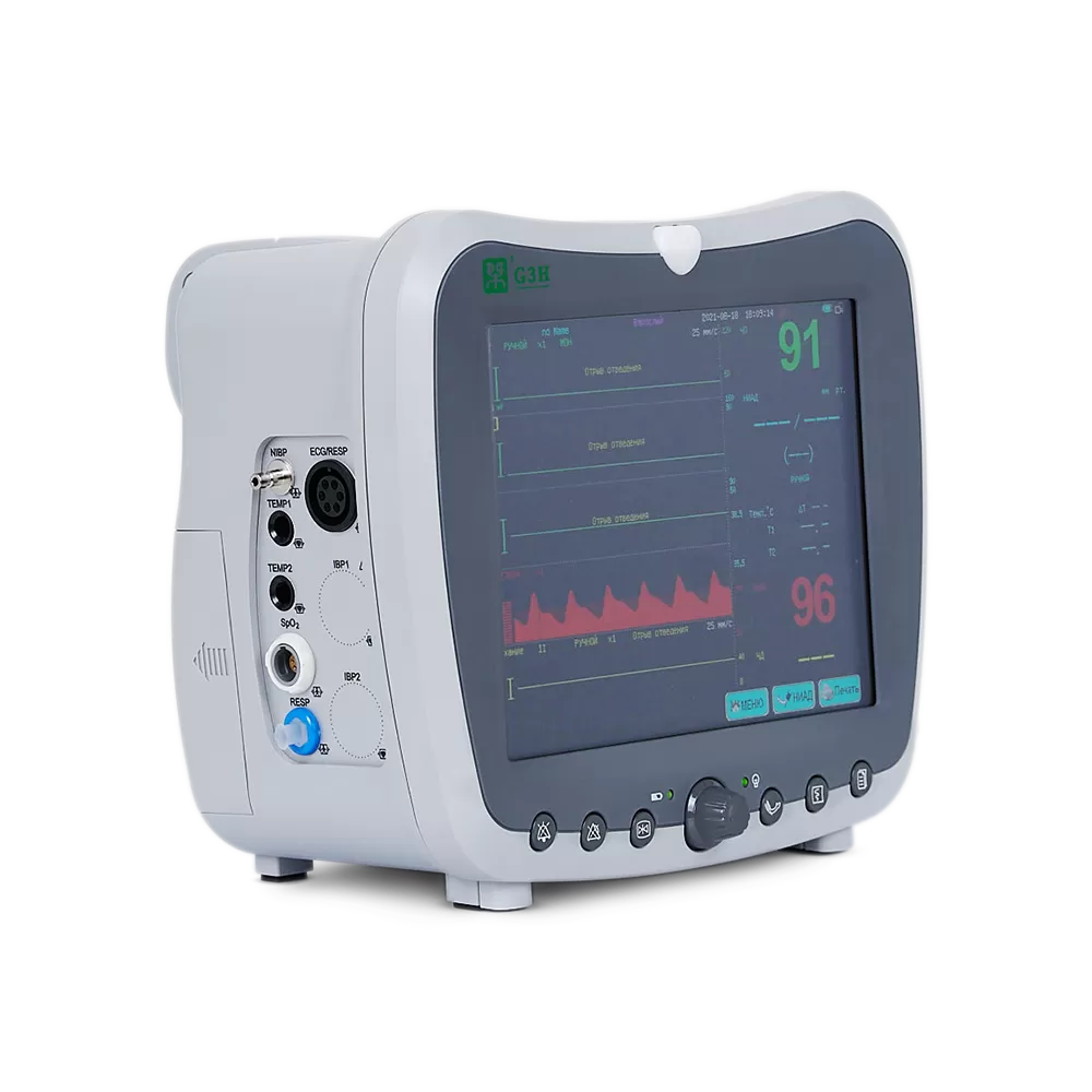 - Монитор измеряет и выводит показатели ЭКГ, ЧСС, NIBP, SpO2, частоты пульса, RESP – респирация (частота дыхания (RR) и дыхание (импеданс или носовая трубка) в виде графика), TEMP – температура.