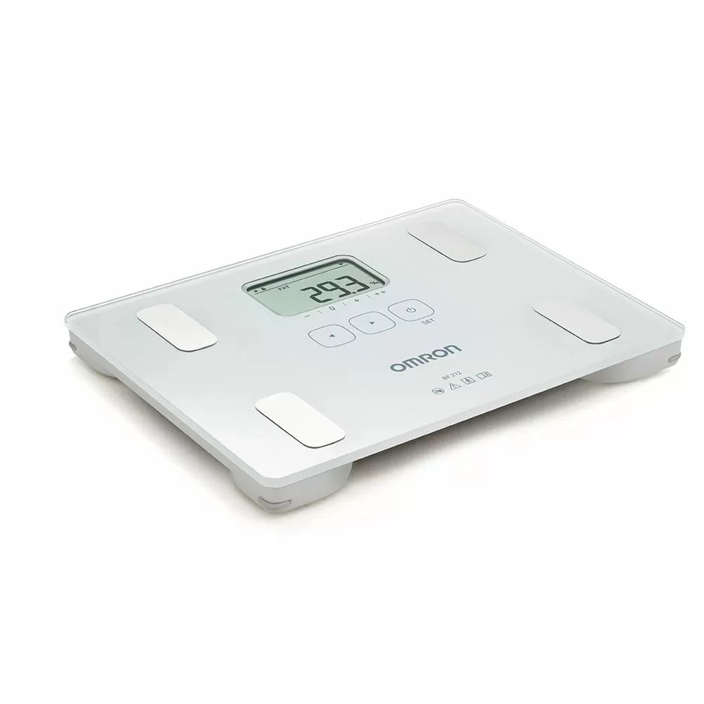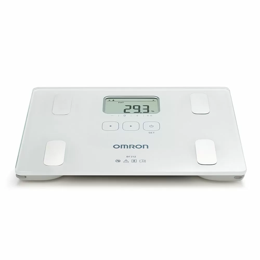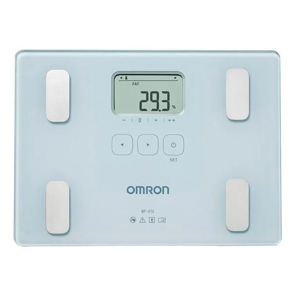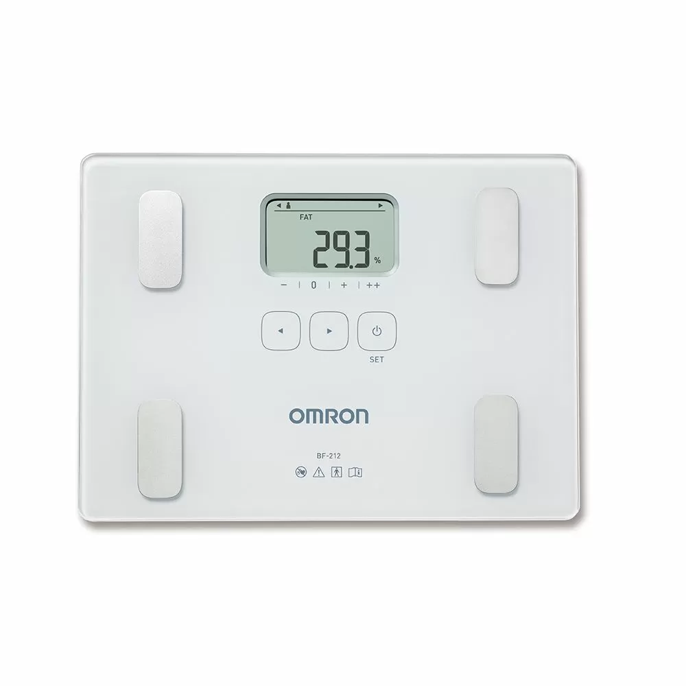 - Определяет общее содержание жира. Прибор измеряет процентное содержание жира в организме методом биоэлектрического импеданса (БИ). Такие ткани организма, как мышцы, кровеносные сосуды и кости, содержат много воды — хорошего проводника электричества. Жир представляет собой ткань, обладающую низкой электропроводностью. Прибор OMRON BF214 пропускает через тело чрезвычайно слабый электрический ток с частотой 50 кГц и силой менее 500 µA, чтобы определить количество жировой ткани. При работе прибора этот слабый электрический ток не ощущается. Чтобы определить по шкале состав тела, прибор OMRON учитывает полное электрическое сопротивление, а также данные о Вашем росте, весе, возрасте и поле, и на основе полученных данных выдает результат о составе тела.