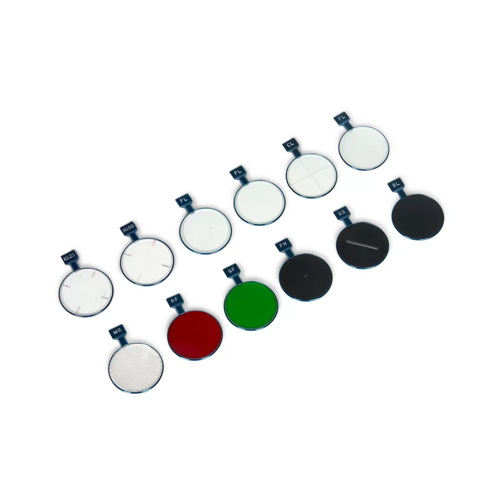 Матированная линза, Щелевая и Точечная диафрагмы, Окклюдер, Красный светофильтр, Зелёный светофильтр, цилиндр Мэддокса, Плоскопараллельная пластина, Линза с перекрестием, Скрещенные цилиндры  |