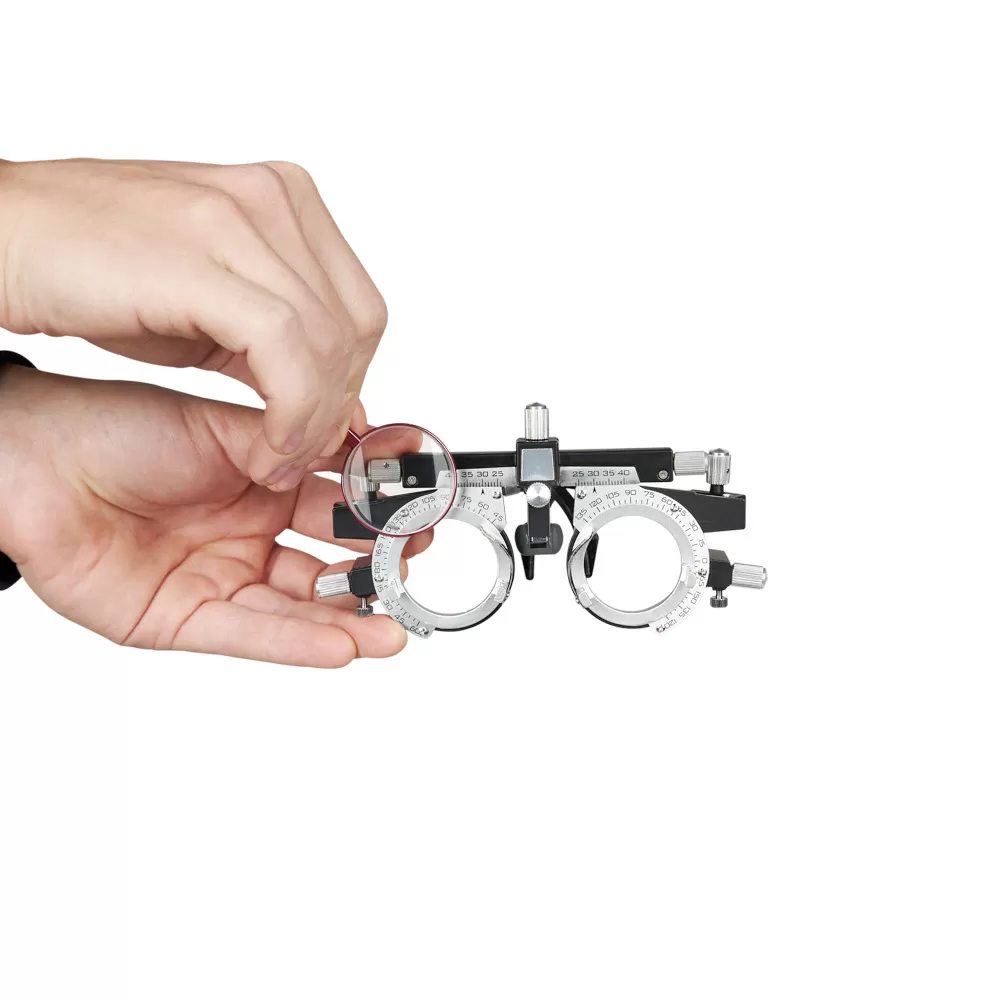 - В комплекте есть специальная универсальная пробная оправа со множеством различных регулировок. Это позволяет проводить обследование зрения пациентам с различной формой головы. Универсальная оправа позволяет установить до 4-х линз одновременно для более детального обследования зрения.