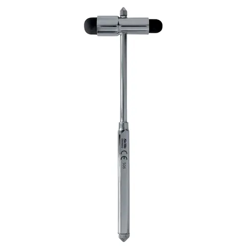 Компактный и легкий неврологический молоток Бак из нержавеющей хромированной стали. В основании рукоятки размещена игла, в основании головки - кисточка. В полиэтиленовой упаковке.