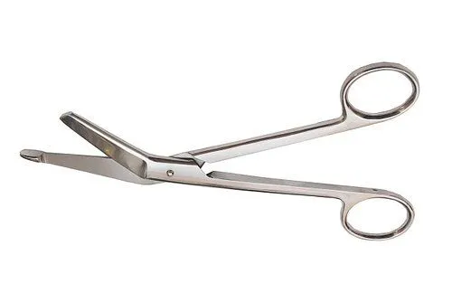Ножницы для разрезания повязок с пуговкой. Двухлезвийный режущий медицинский инструмент с кольцевыми ручками лезвия изогнуты под углом, обушок одного из лезвий утолщен и расплющен на конце.