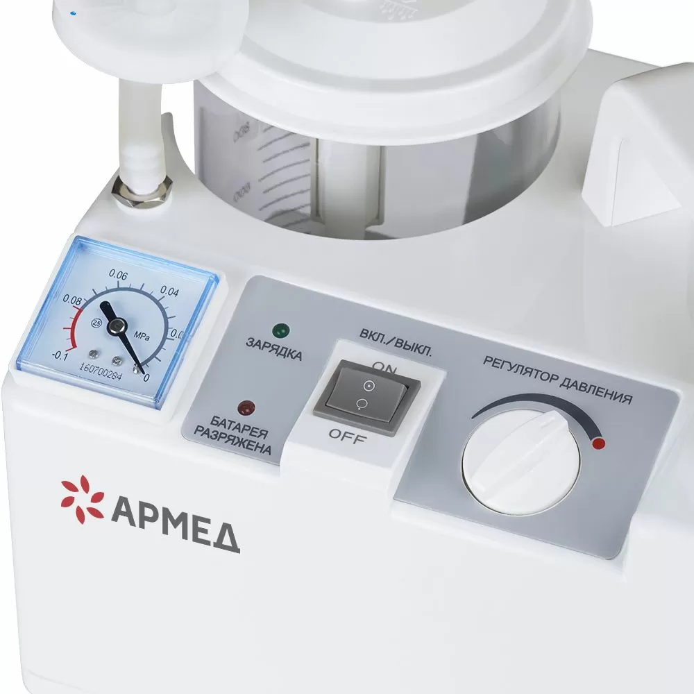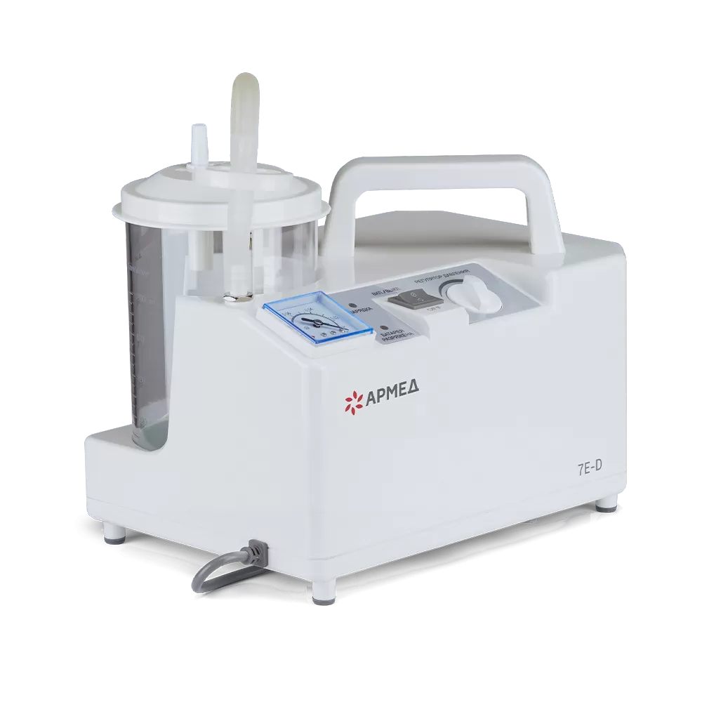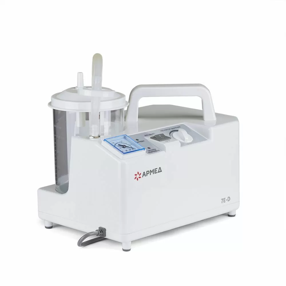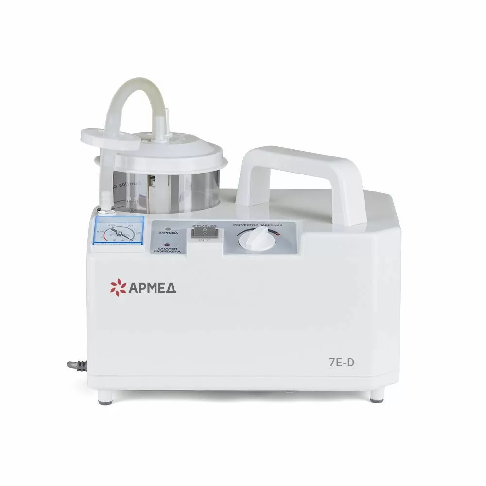 - Отсасыватель Армед 7E-D может работать от сети 220 В, встроенного аккумулятора и автомобильного прикуривателя 12 В. Это позволяет использовать его в стационаре, автомобилях скорой помощи и в экстренных ситуациях. Время работы от аккумулятора составляет 30 минут.