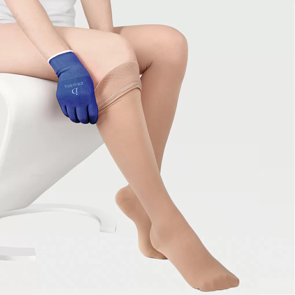 - с помощью перчаток надевание компрессионного трикотажа (колготок, чулок и гольфов) не требует особых усилий и выполняется аккуратнее и быстрее