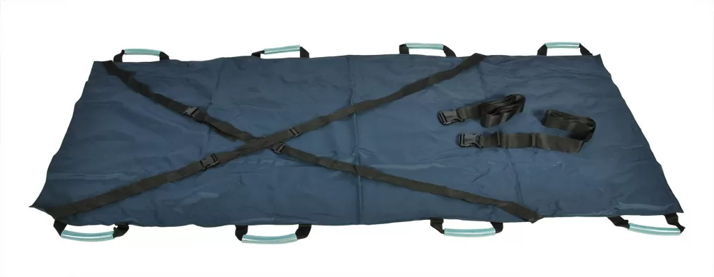 Модель весом всего 1,5 кг рассчитана на нагрузку до 159 кг. Оптимальные размеры полотна носилок подходят для пациентов любого роста и комплекции. По периметру изделия расположены 8 ручек со специальными накладками для удобного хвата. Мягкие плащевые носилки позволяют транспортировать человека в положениях сидя и лёжа. Положение сидя реализуется с помощью двух плечевых ремней, входящих в комплект. В конструкции также предусмотрены фиксирующие ремни для безопасности пострадавшего.