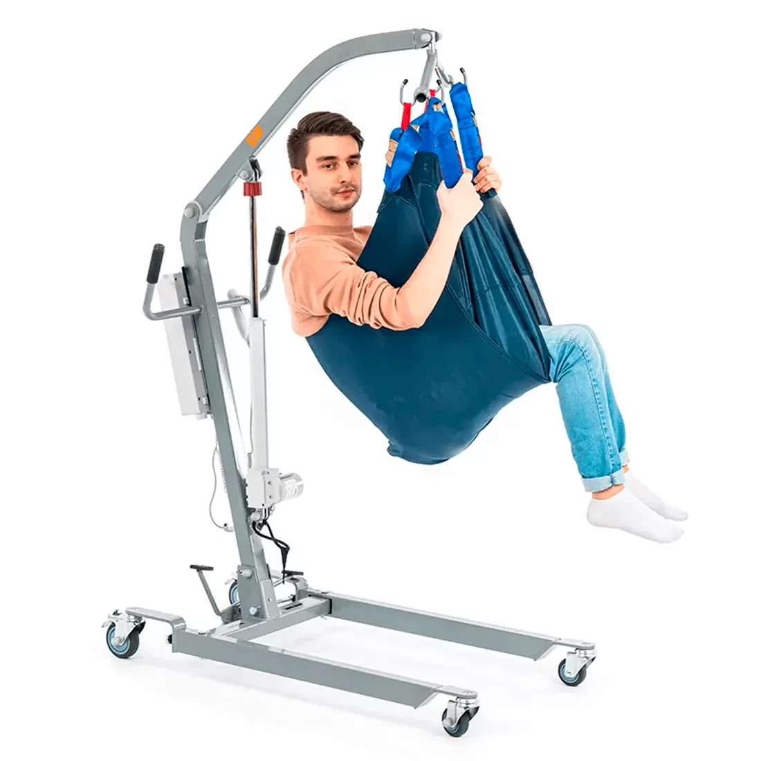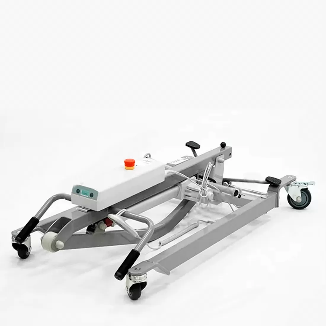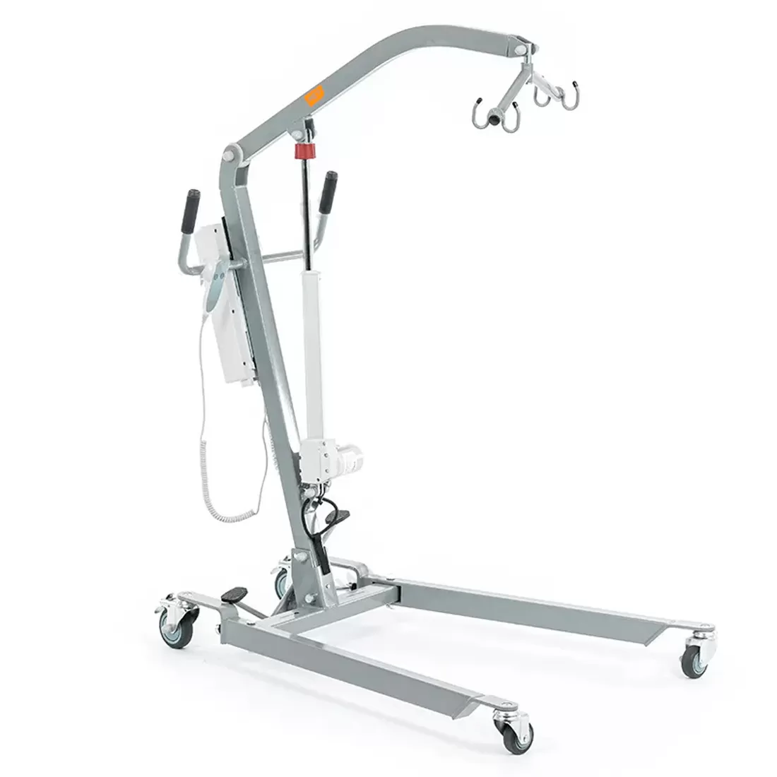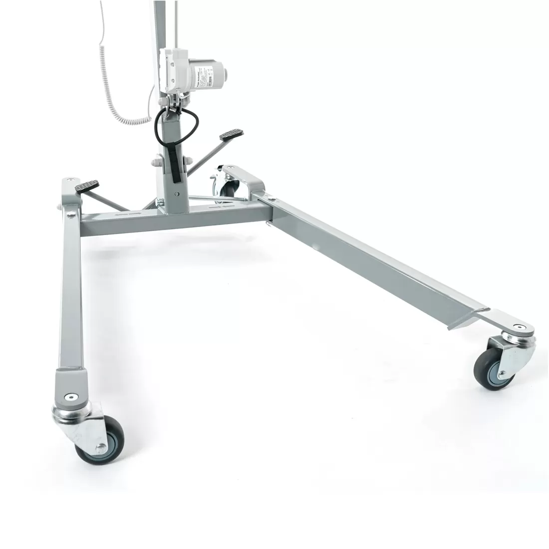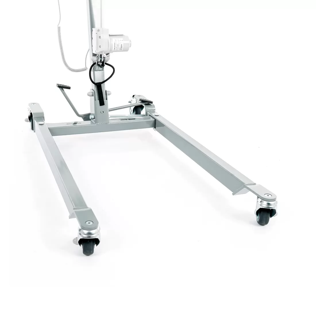 Электрический прикроватный подъёмник, выполненный на металлической раме, складывающейся для удобства хранения и транспортировки. Раздвижные передние колёсные опоры высотой всего 115 мм для максимальной устойчивости и возможности заезда под низкую мебель.