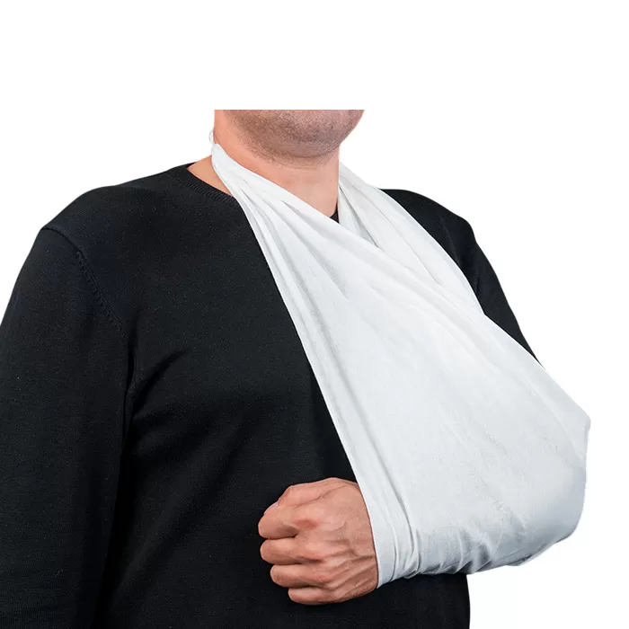 - поместите конечность чуть ниже середины косынки, прямой угол которой направлен в сторону локтя, а основание располагается на груди по оси тела;