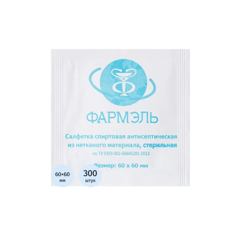 - Салфетка антисептическая для инъекций Фармэль спиртовая 60×60 мм (300 штук в упаковке)