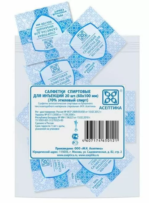 Салфетка «Асептика» пропитана 70% этиловым спиртом, обеспечивает эффективную санацию кожи в зоне постановки инъекций и сокращает количество манипуляций (вата, спирт).