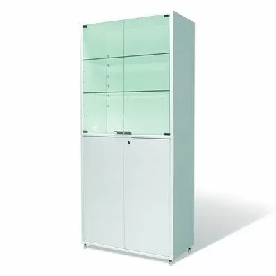 - В верхней части: двухстворчатая стеклянная дверца и две стеклянных полки