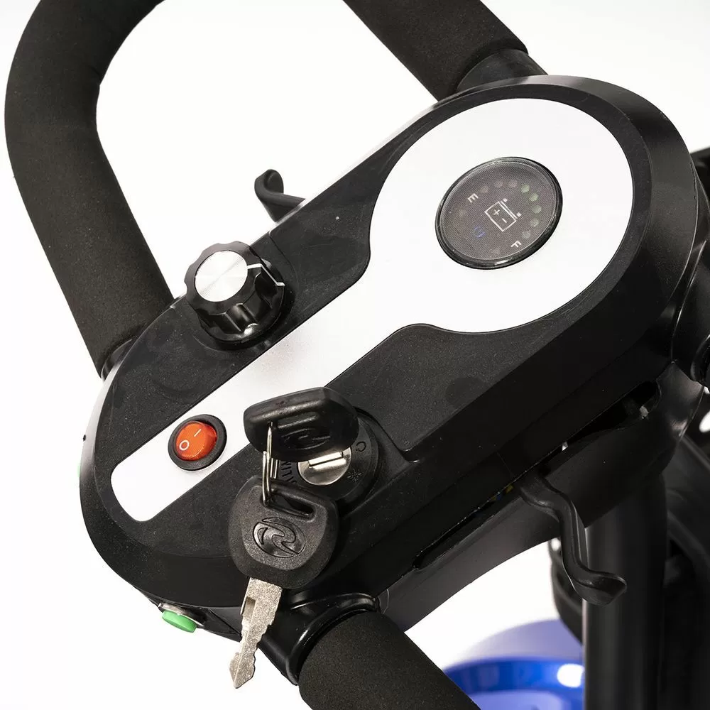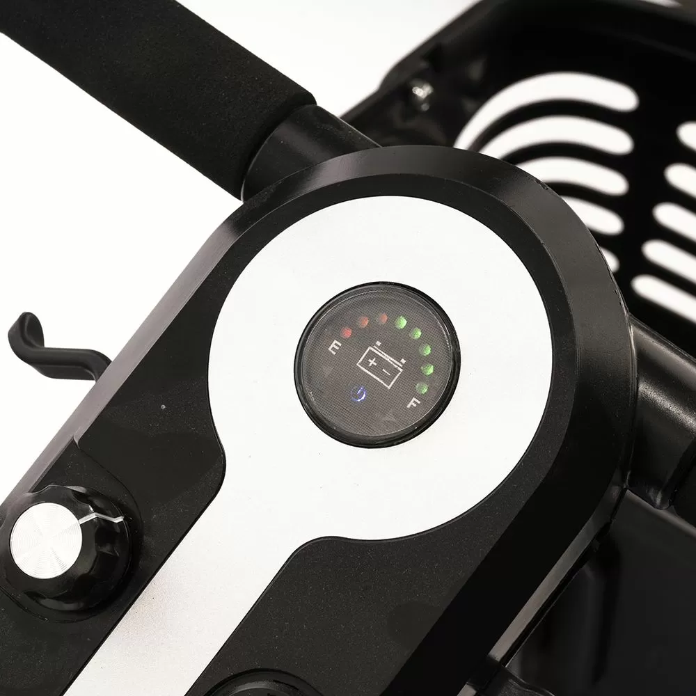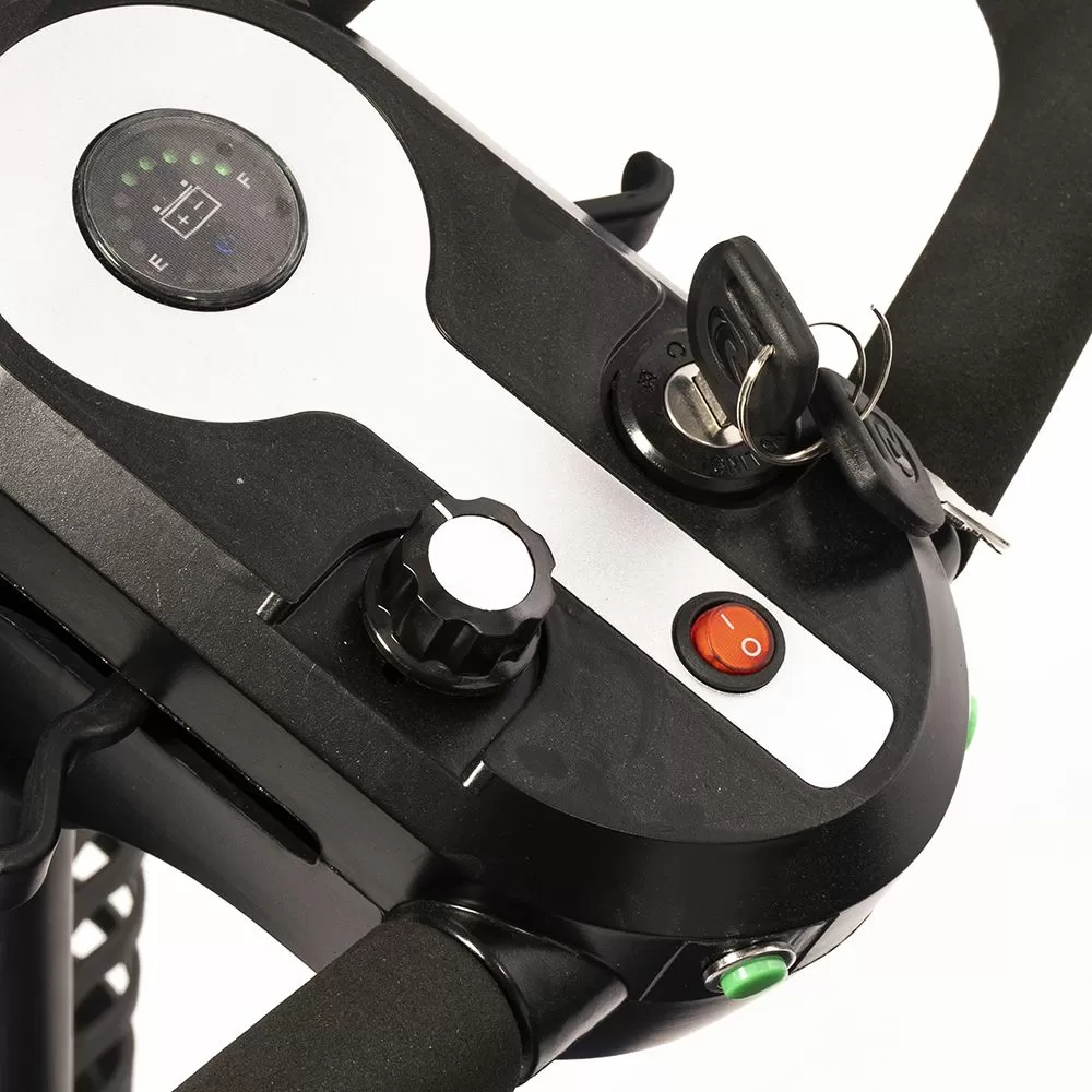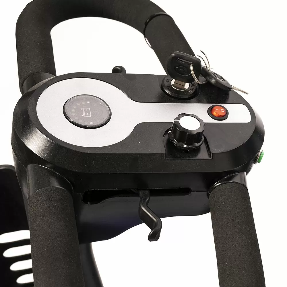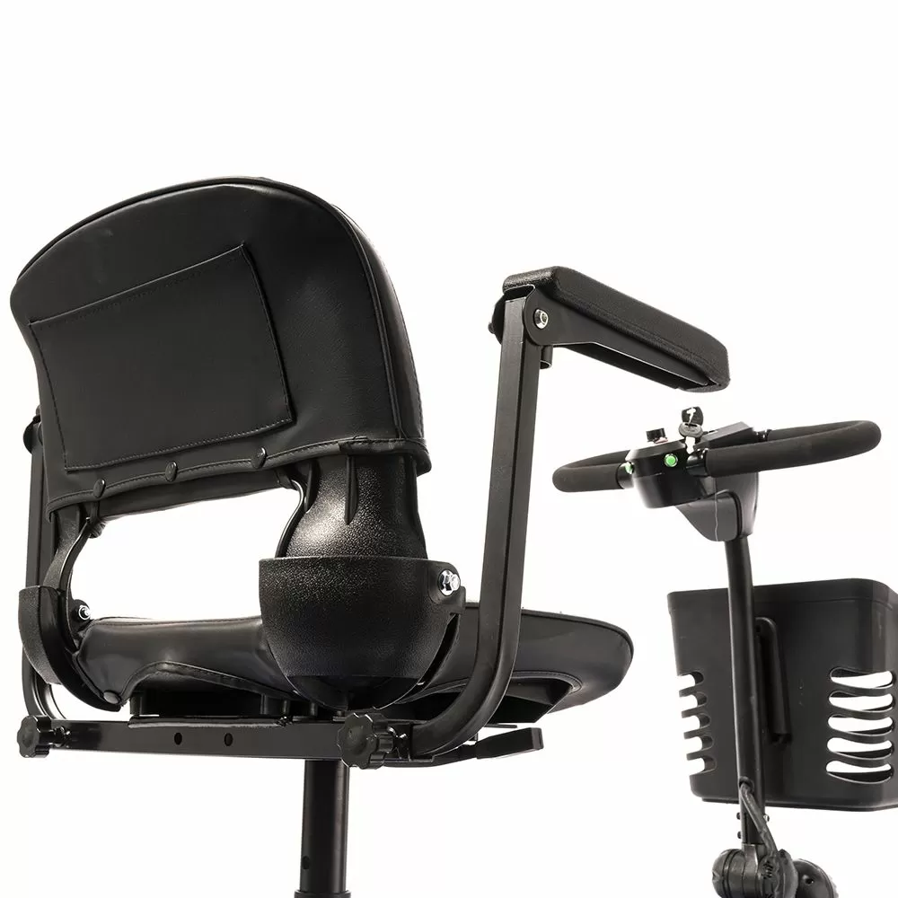 Оснащен удобным рулем, на котором располагается панель управления, и поворотным сиденьем с откидывающимися подлокотниками. Это позволяет сделать посадку на кресло скутера комфортной даже для пользователей, которые имеют проблемы с опорно-двигательным аппаратом.