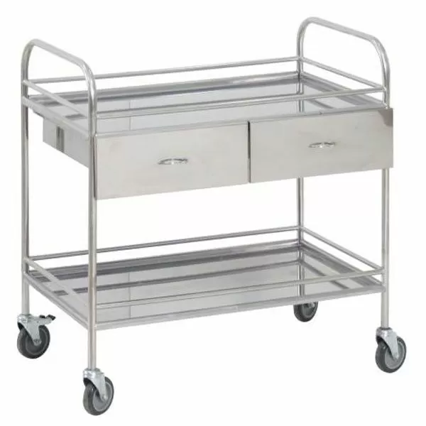 - Каркас столика ― сварная конструкция из нержавеющей стальной трубы, 2 полки с бортиками и 2 выдвижных ящика ― нержавеющий стальной лист