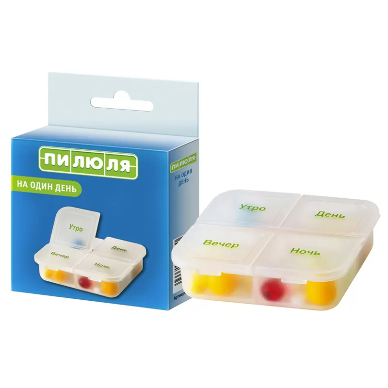 Таблетница  на один день состоит из 4-х отделений для распределения лекарств или витаминов  в соответствии с суточным режимом приема: утро, день, вечер, ночь.